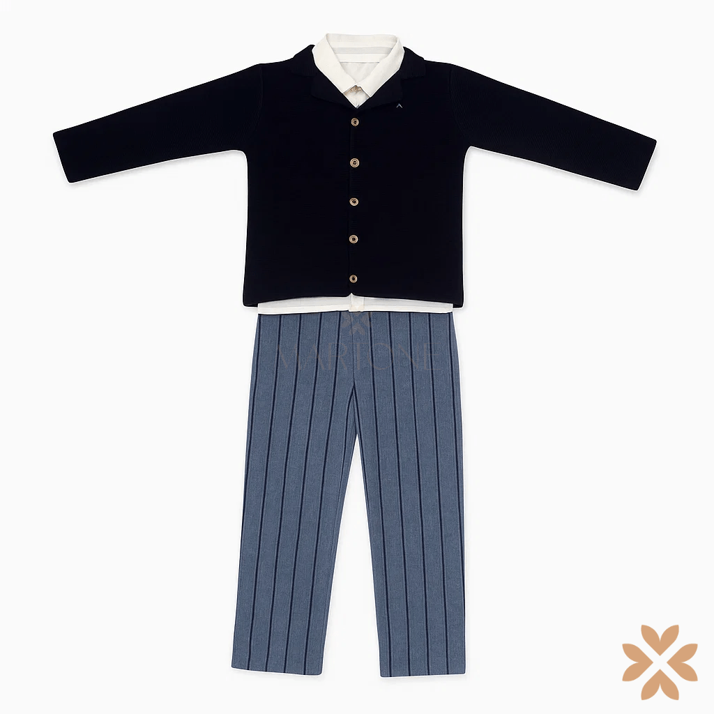 Completo bimbo tre pezzi con pantalone in tessuto spigato a righe a linea dritta, camicia bianca in cotone con colletto classico e abbottonatura frontale, cardigan blu con colletto e chiusura a bottoni.