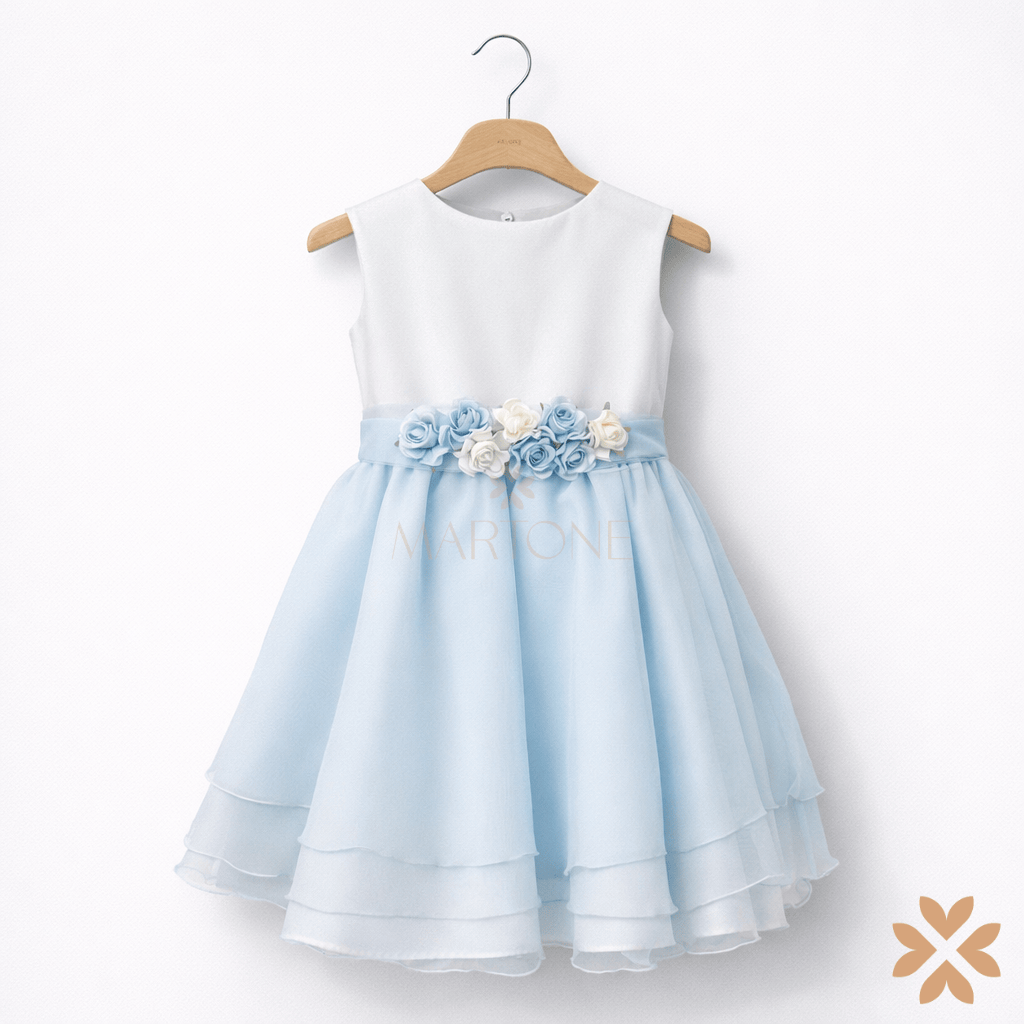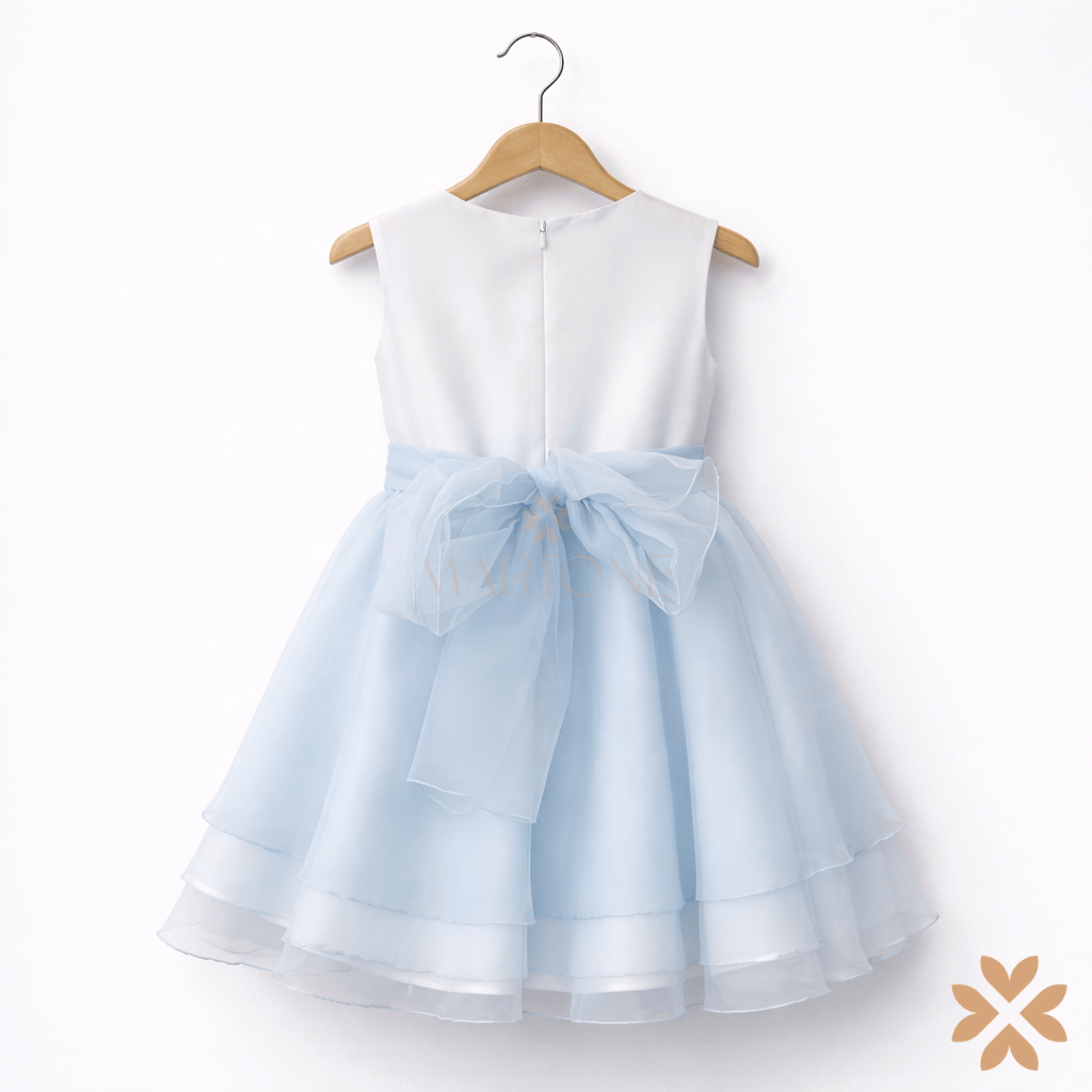 Abito da cerimonia per bambina realizzato in tessuto satinato con gonna in organza azzurro polvere a balze leggere che donano movimento e volume. Il corpino dalla linea essenziale è valorizzato da una fascia in vita con applicazioni floreali nei toni coordinati, mentre il retro è impreziosito da un elegante fiocco in organza. Chiusura con zip posteriore. Un capo di top quality, raffinato e armonioso, ideale per e cerimonie speciali.