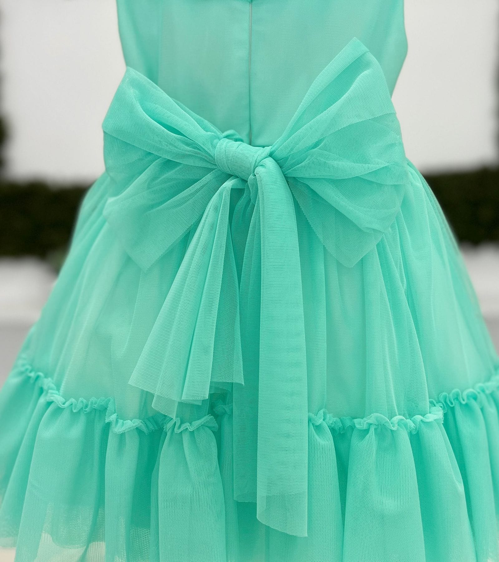 Abito bimba in tulle a balze con con volant e fiocco sul retro.