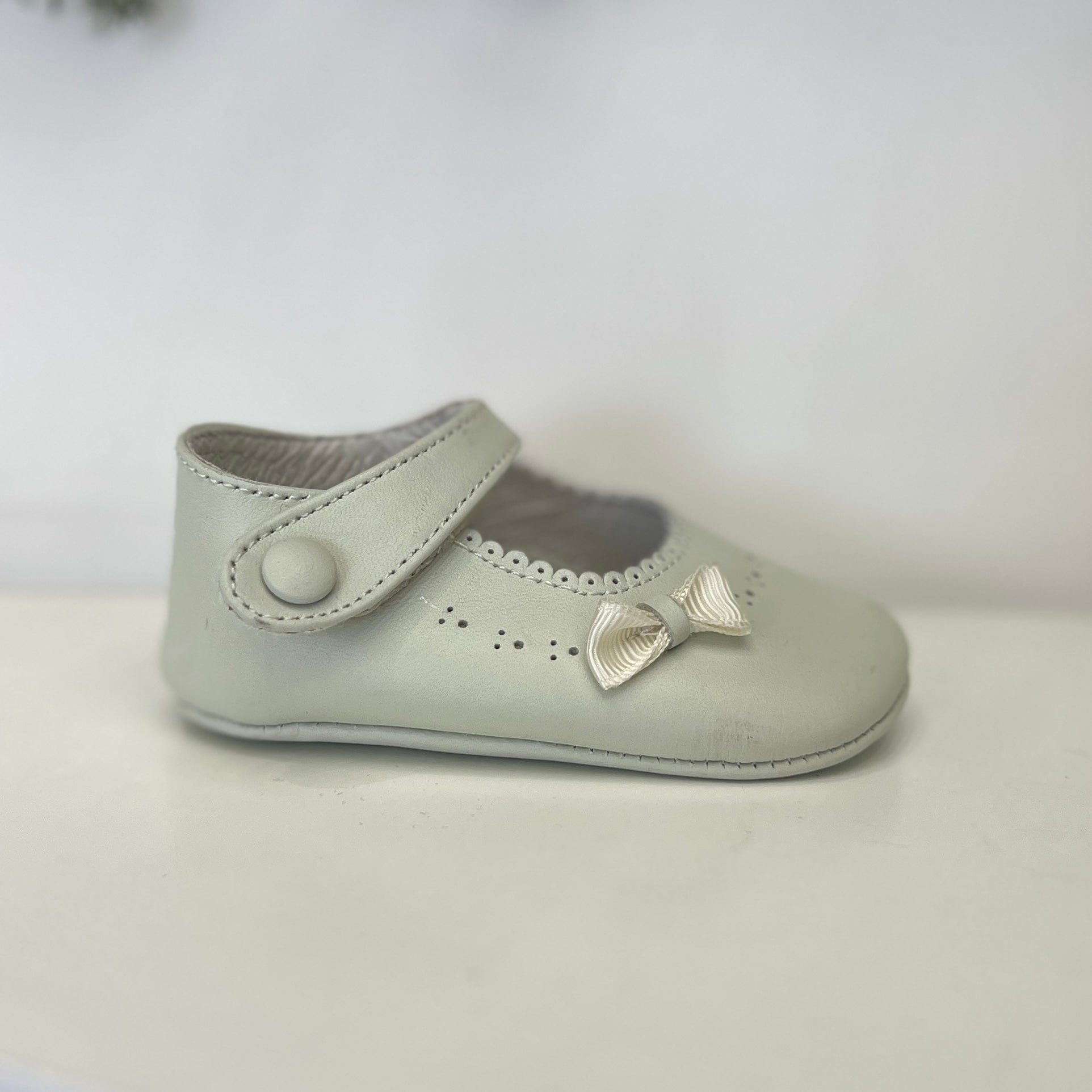 Ballerina da culla in ecopelle con trafori, cinturino con velcro e fiocchetto laterale.