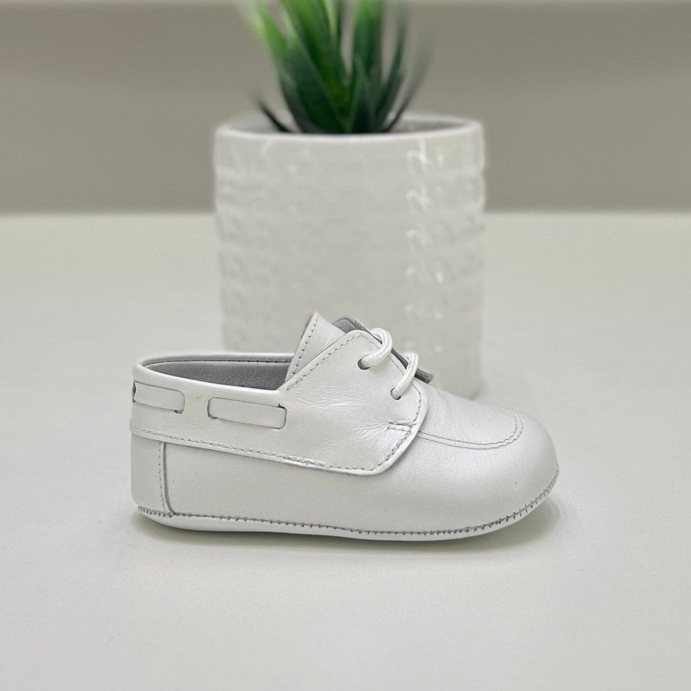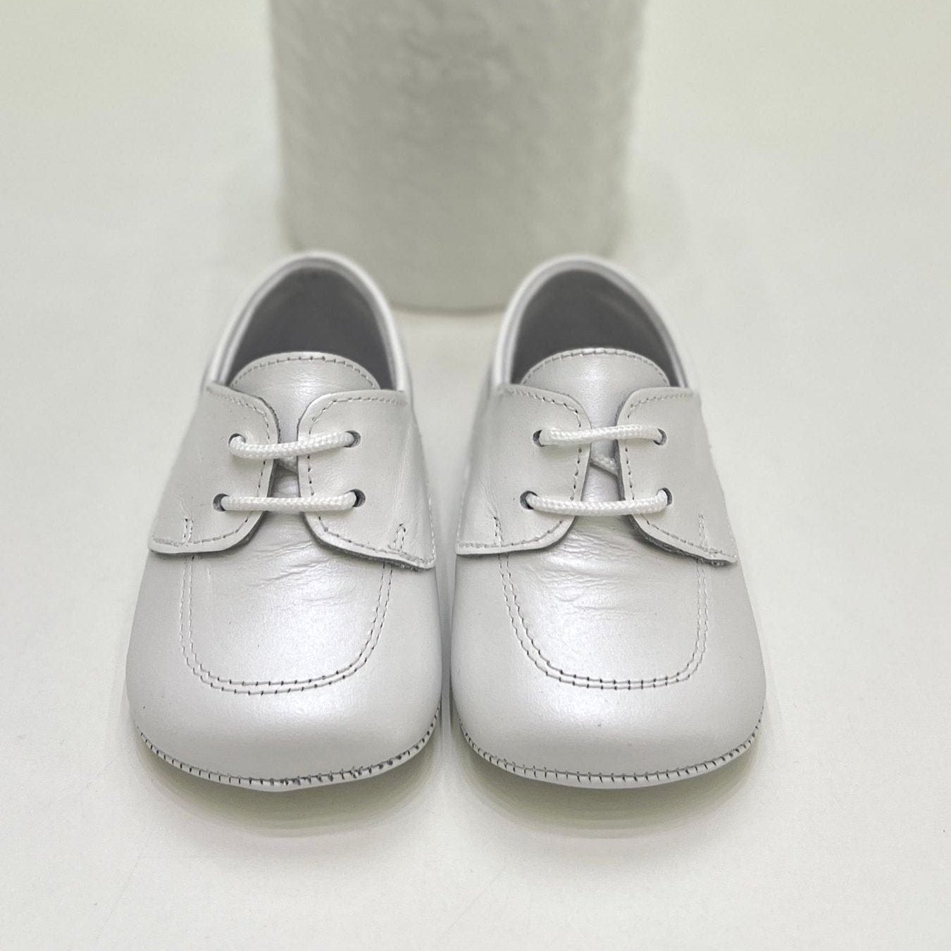 Scarpe da culla neonato in pelle color bianco perlato.