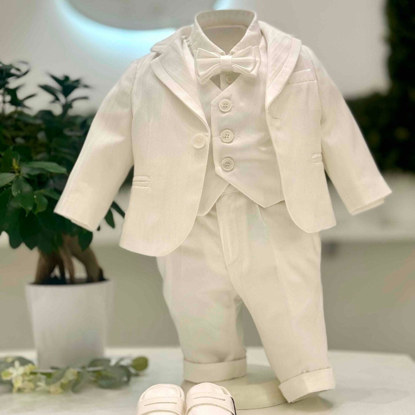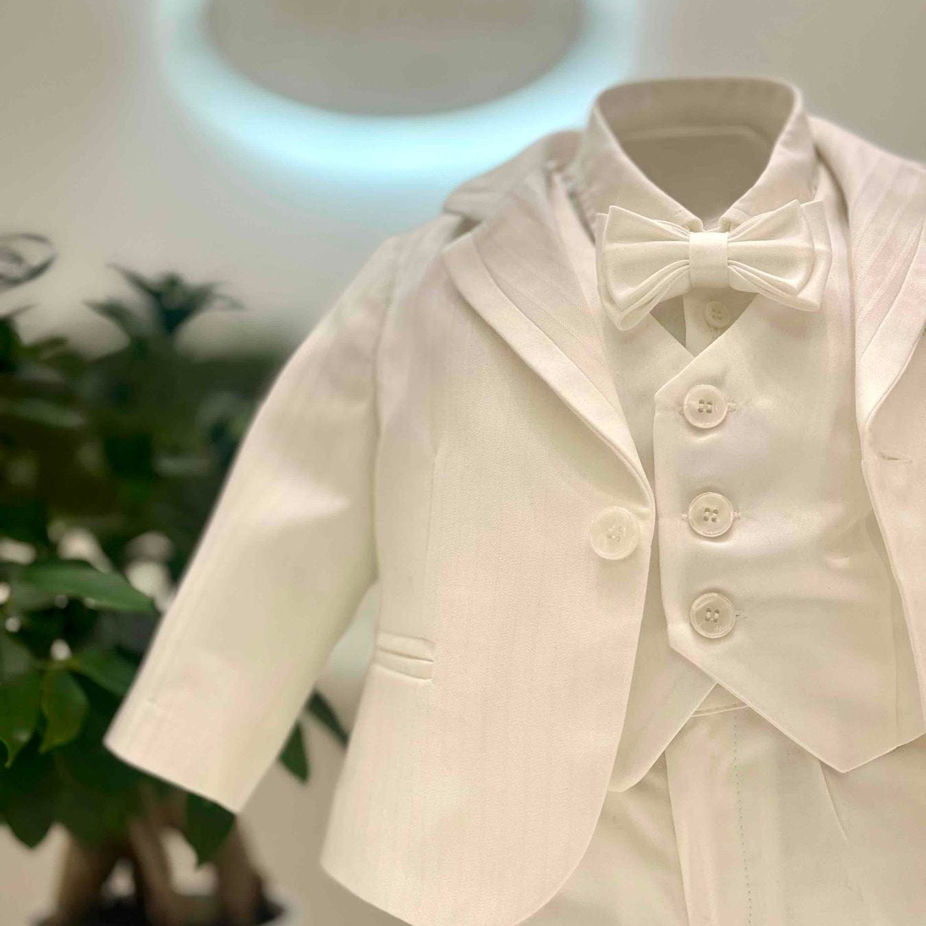 Abito battesimale neonato composto da gilet in cotone operato con trama monocolore a righe, camicia classica in cotone con risvolto, papillon in cotone coordinato, bermuda in cotone con elastico sul retro e fascia smoking removibile.