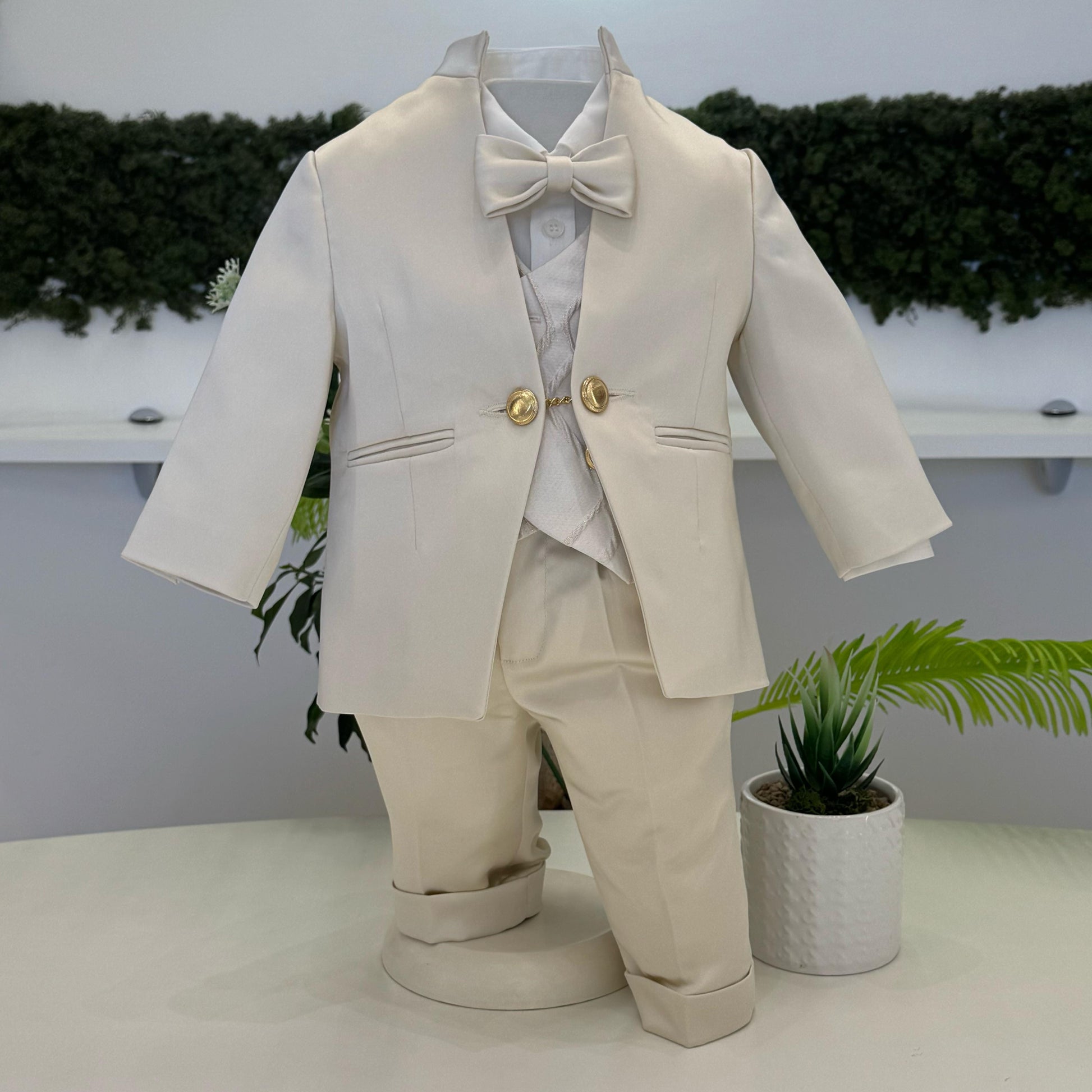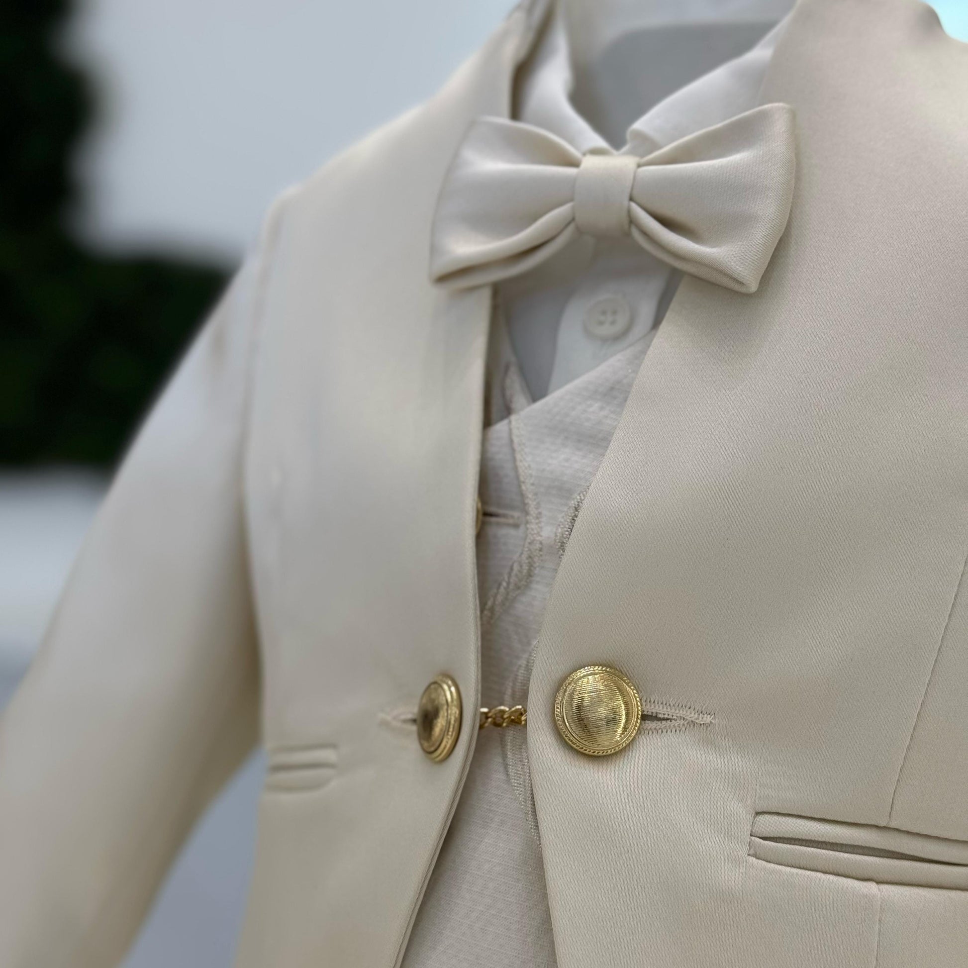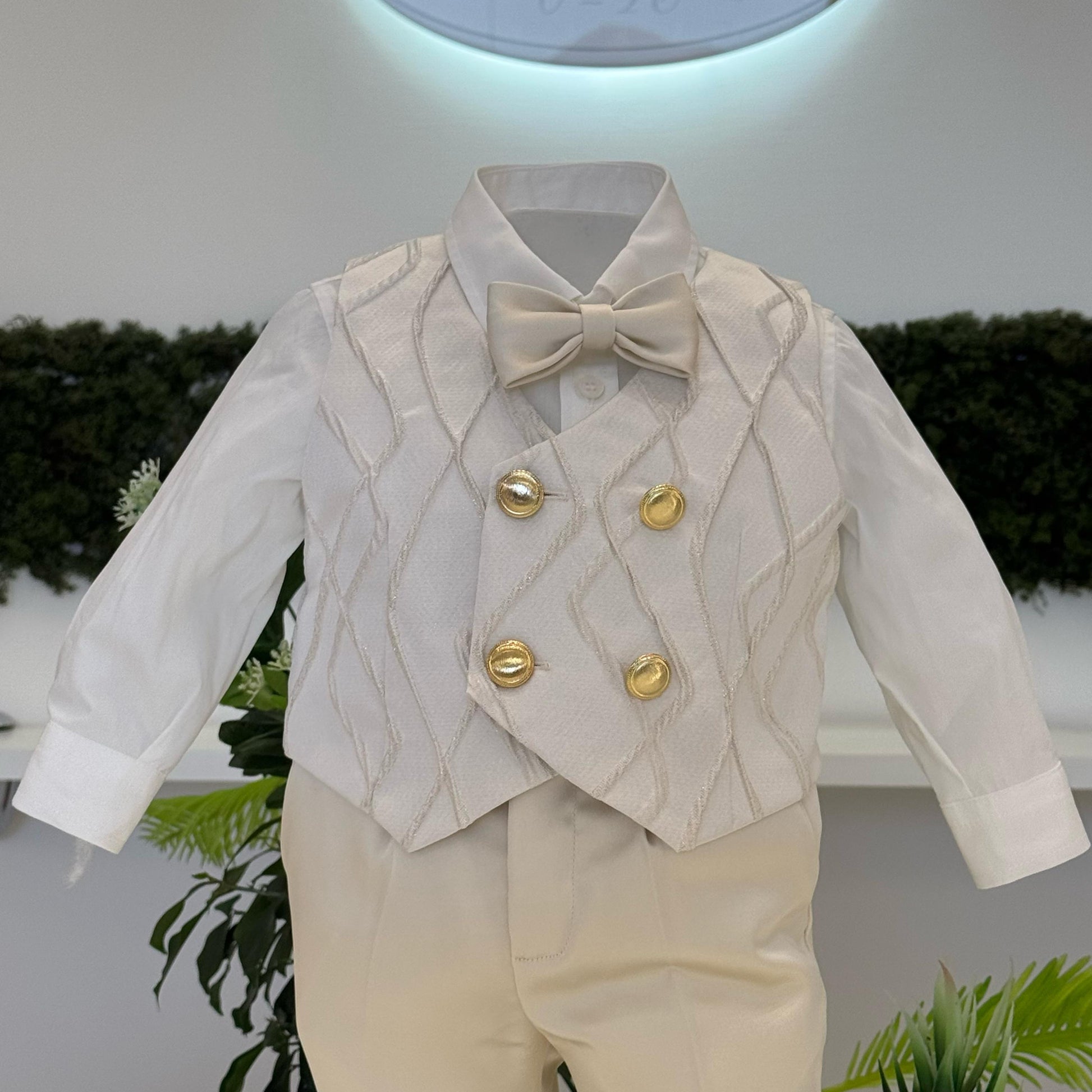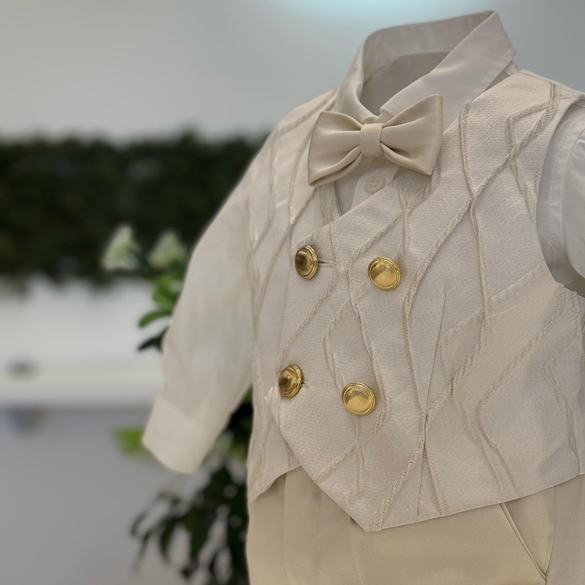 Un abito battesimale da maschietto che esprime lusso ed eleganza in ogni dettaglio. La giacca a taglio coreano liscia, impreziosita da bottoni con catena dorata, si abbina perfettamente al gilet doppiopetto, arricchito da una raffinata fantasia a rilievo con luminescenze. I pantaloni in tessuto lucido color oro, il papillon e la camicia in cotone bianca completano l’outfit con classe e raffinatezza.