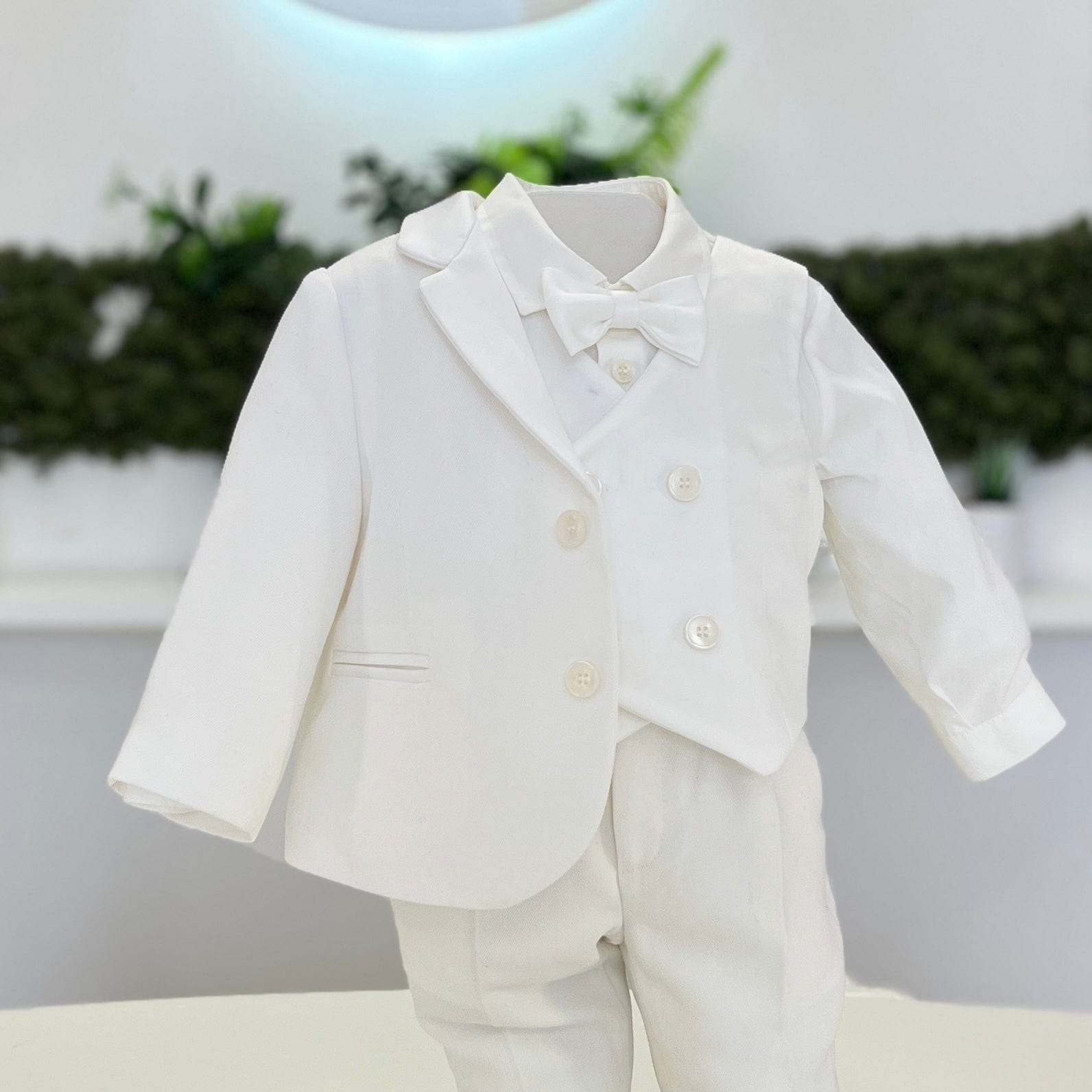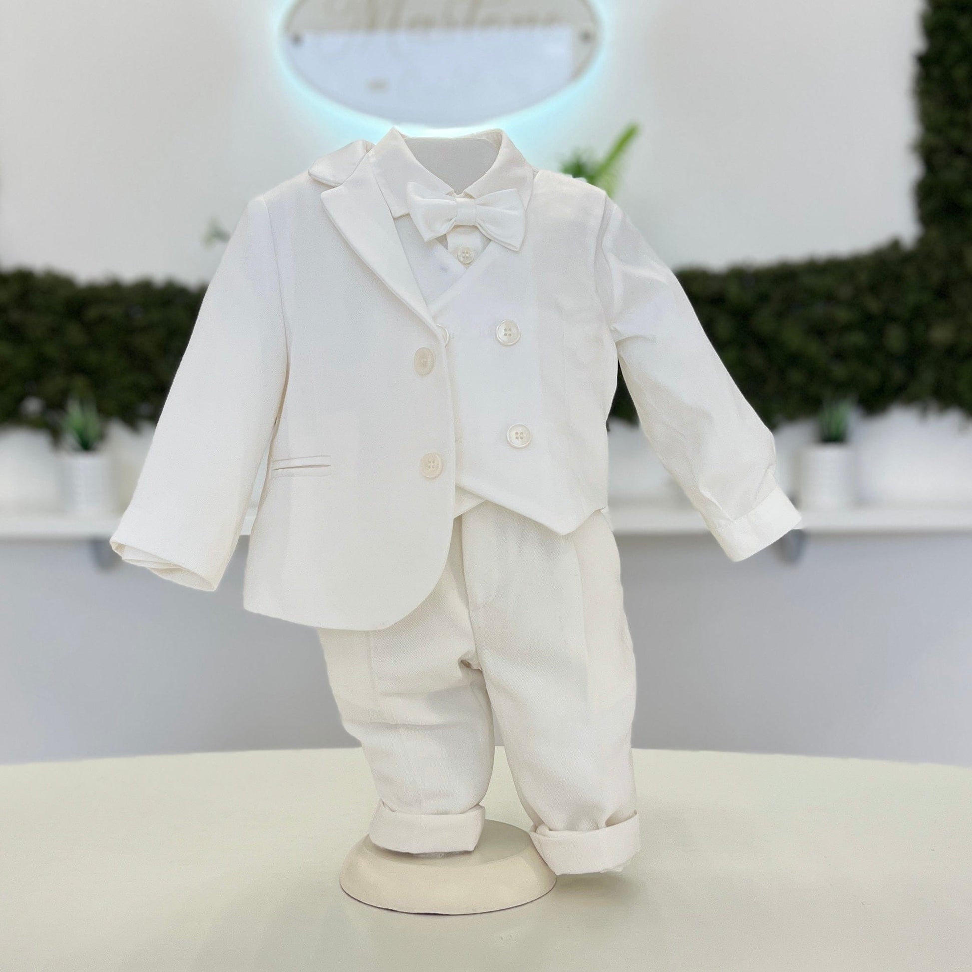 Completo battesimale elegante per bimbo in total white, composto da giacca doppiopetto con rever classico, gilet coordinato e pantalone con risvolto. La camicia con colletto tradizionale è abbinata a un papillon tono su tono, per un effetto impeccabile e raffinato. La linea strutturata della giacca e la morbidezza del tessuto assicurano un equilibrio perfetto tra eleganza cerimoniale e comfort. Un completo pensato per rendere speciale il giorno del Battesimo con uno stile puro e sofisticato.