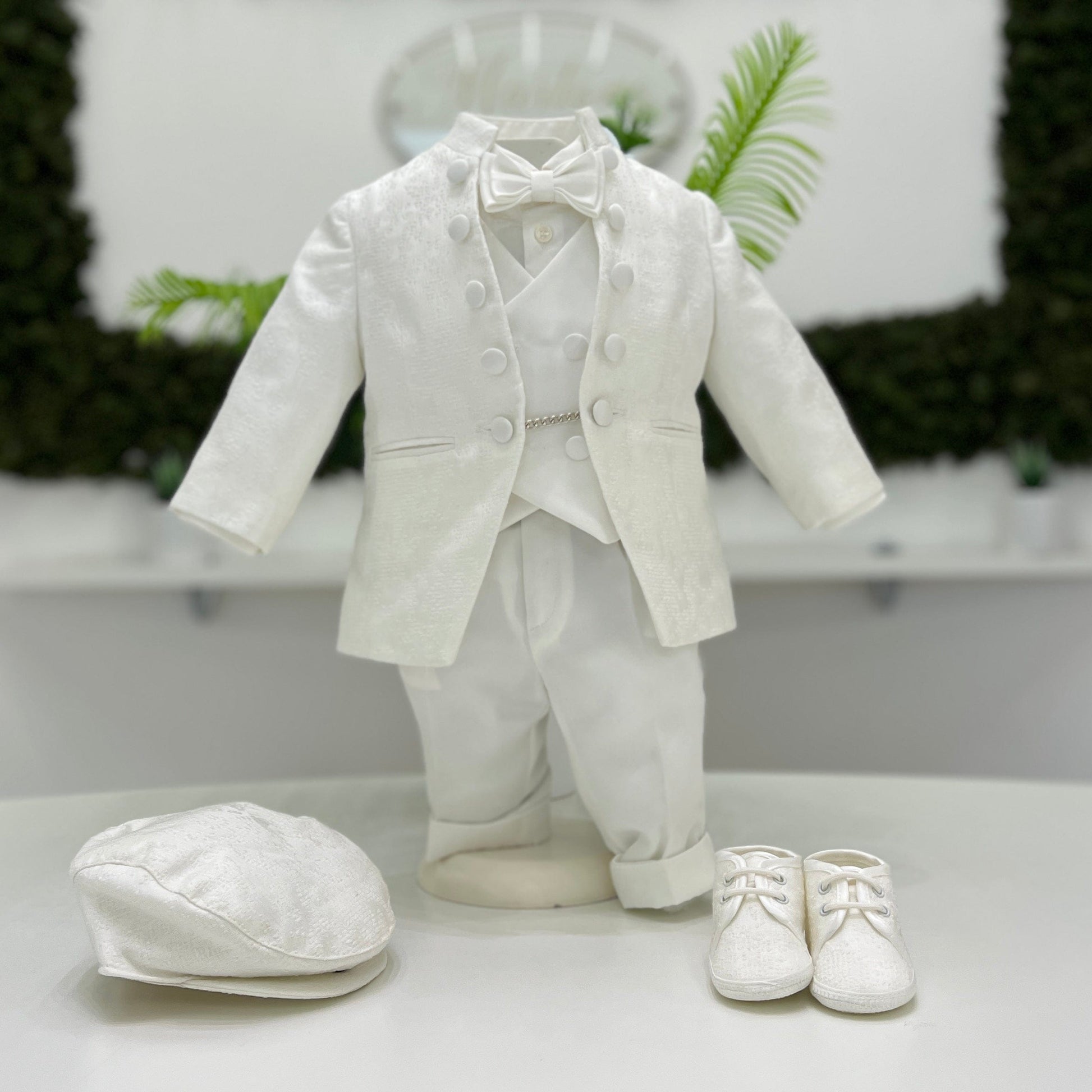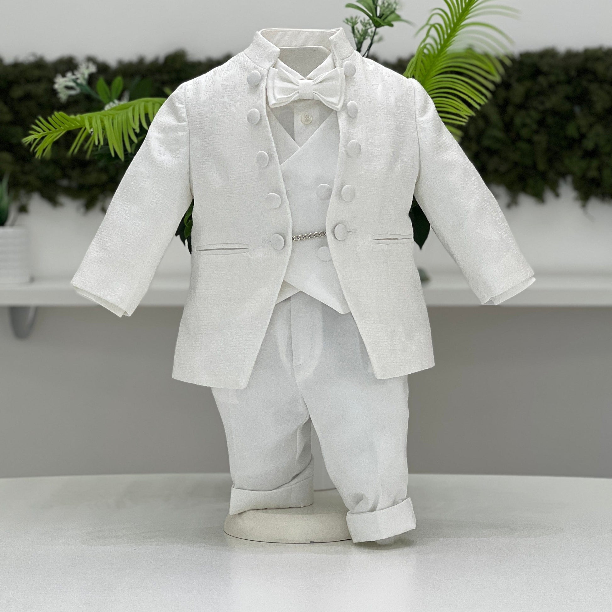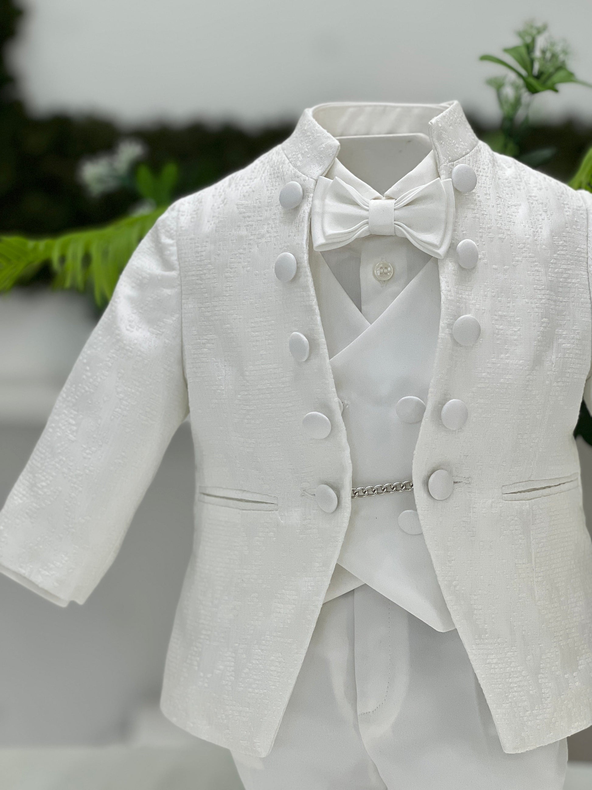 Abito battesimale jacquard panna, composto da giacca con collo alla coreana e bottoni rivestiti, gilet doppiopetto con catena decorativa e pantalone coordinato. Un completo raffinato, pensato per celebrare con stile un’occasione unica.