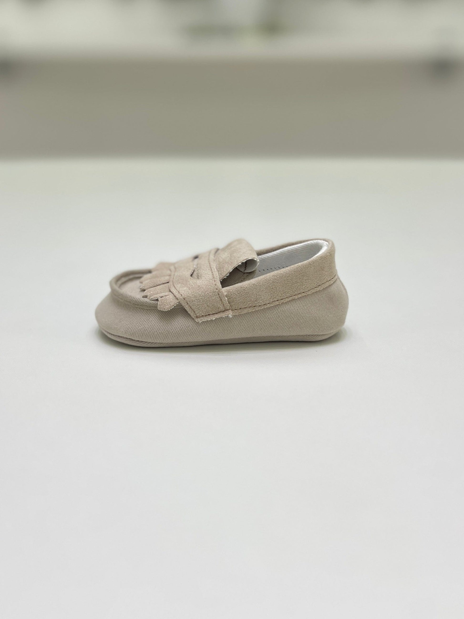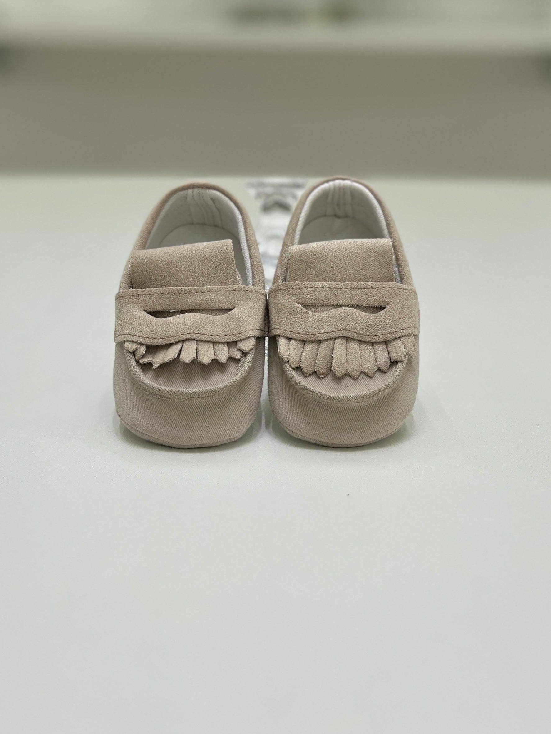 Scarpina per neonato modello mocassino scamosciato con frange.