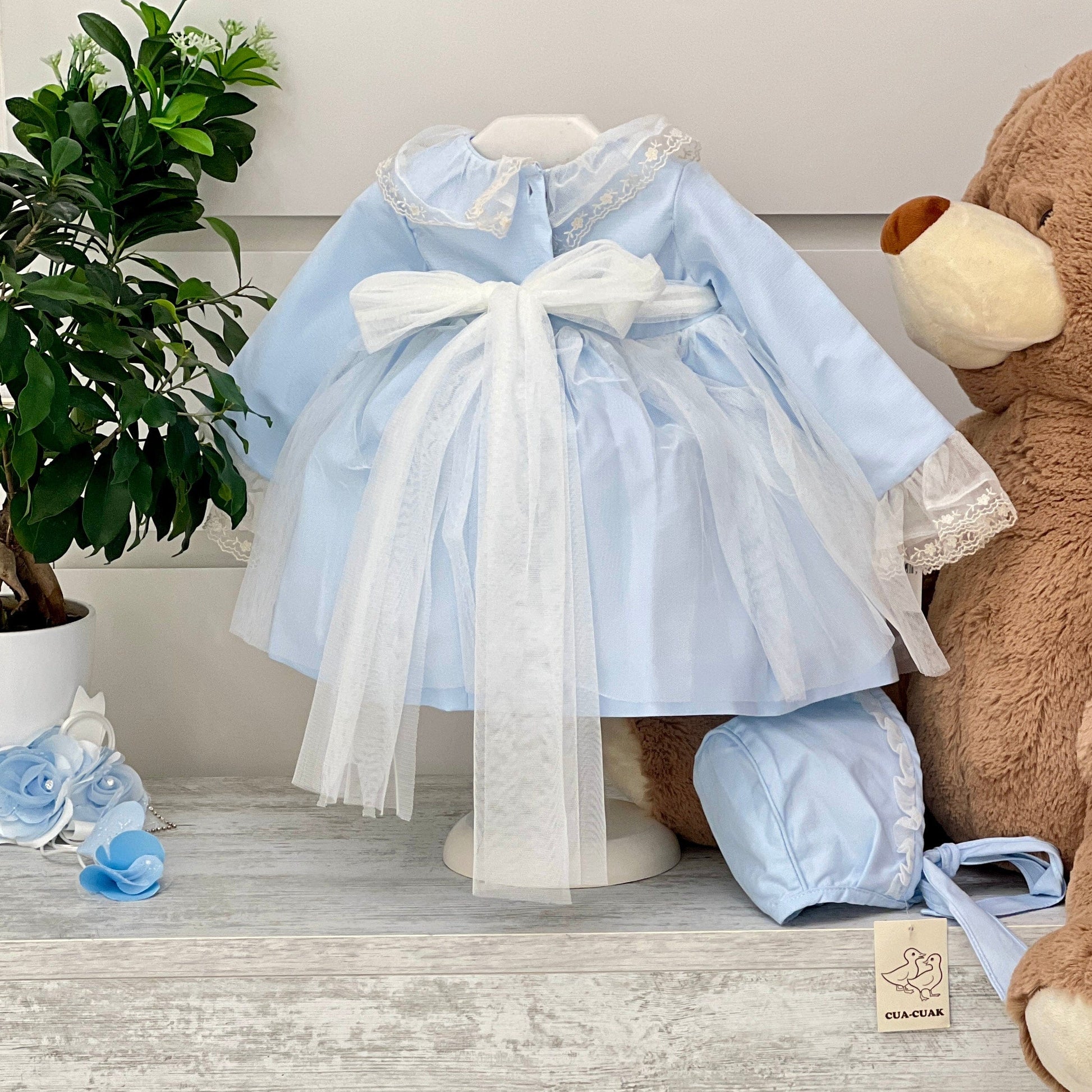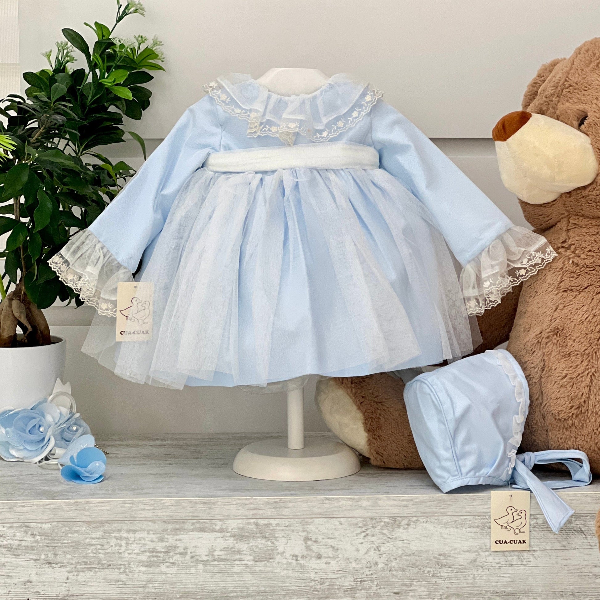 Abito elegante modello bambolina, rifinito in tulle e pizzo.