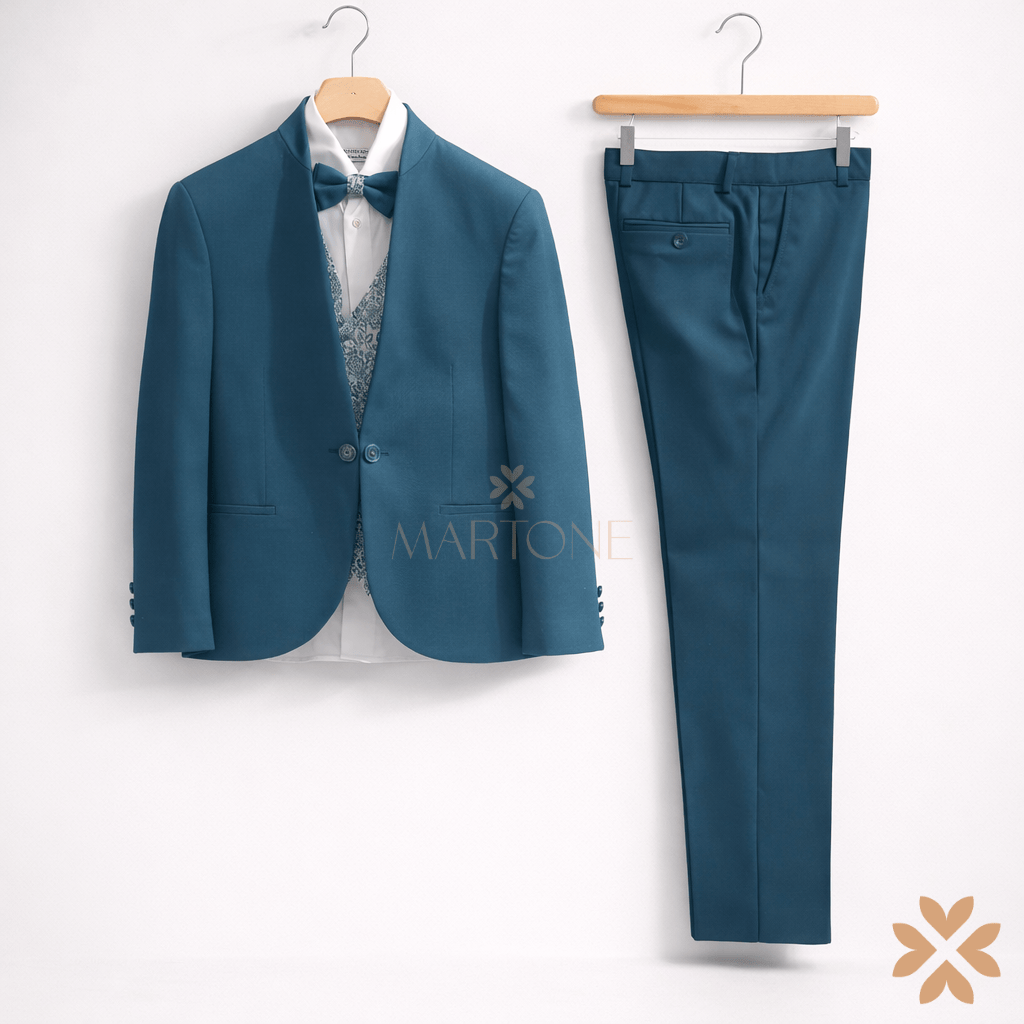 Abito da comunione da bambino in tonalità ottanio, composto da giacca sartoriale con collo alla coreana, pantalone lungo coordinato, gilet jacquard con fantasia raffinata, camicia bianca e papillon abbinato. Linea pulita e proporzioni impeccabili, con taschino a filetto e bottoni coordinati. Vestibilità ordinata e struttura sartoriale per un look distintivo e contemporaneo. Ideale per Prima Comunione e cerimonie eleganti, per chi desidera uno stile ricercato e moderno.