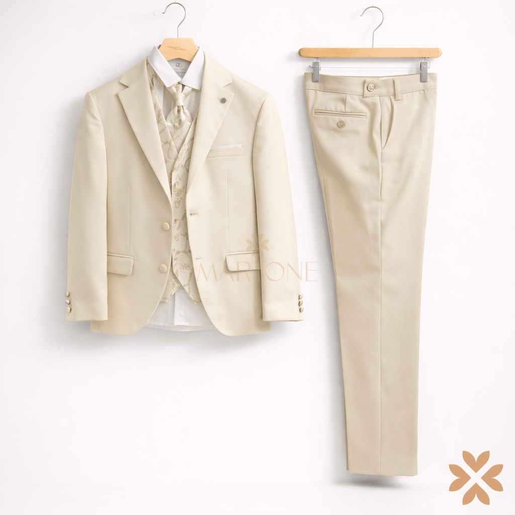 Abito da comunione da bambino in tonalità beige chiaro, composto da giacca sartoriale, pantalone lungo coordinato, gilet jacquard, camicia bianca e cravatta abbinata. Linea pulita e struttura impeccabile, con taschino a filetto e bottoni rivestiti per una finitura raffinata. Il gilet fantasia aggiunge un tocco distintivo mantenendo un’eleganza sobria e luminosa. Vestibilità ordinata ed equilibrata, ideale per una Prima Comunione dallo stile classico e senza tempo.