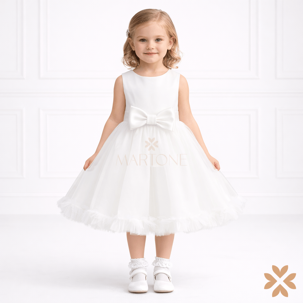 Abito da cerimonia in tulle e mikado, composto da corpetto o liscio in mikado, cintura con dettaglio con fiocco frontale, gonna foderata in mikado con balza in tulle e bordo in tulle arricciato