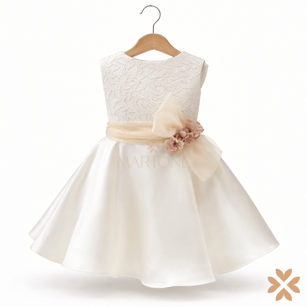 Abito da cerimonia in mikado e pizzo macramè, con cintura in vita avorio e dettaglio floreale.