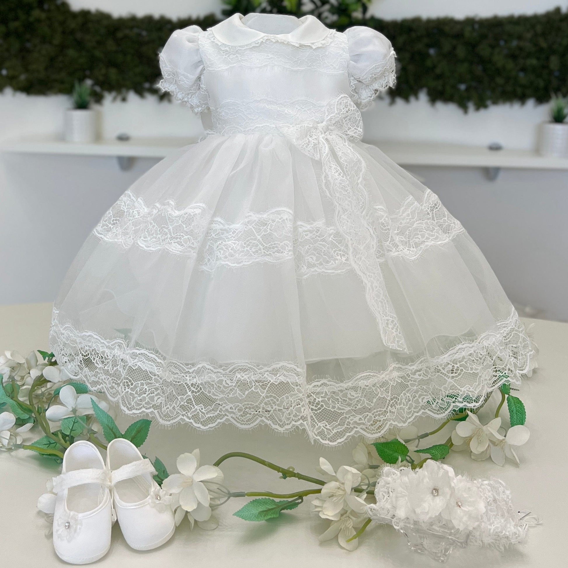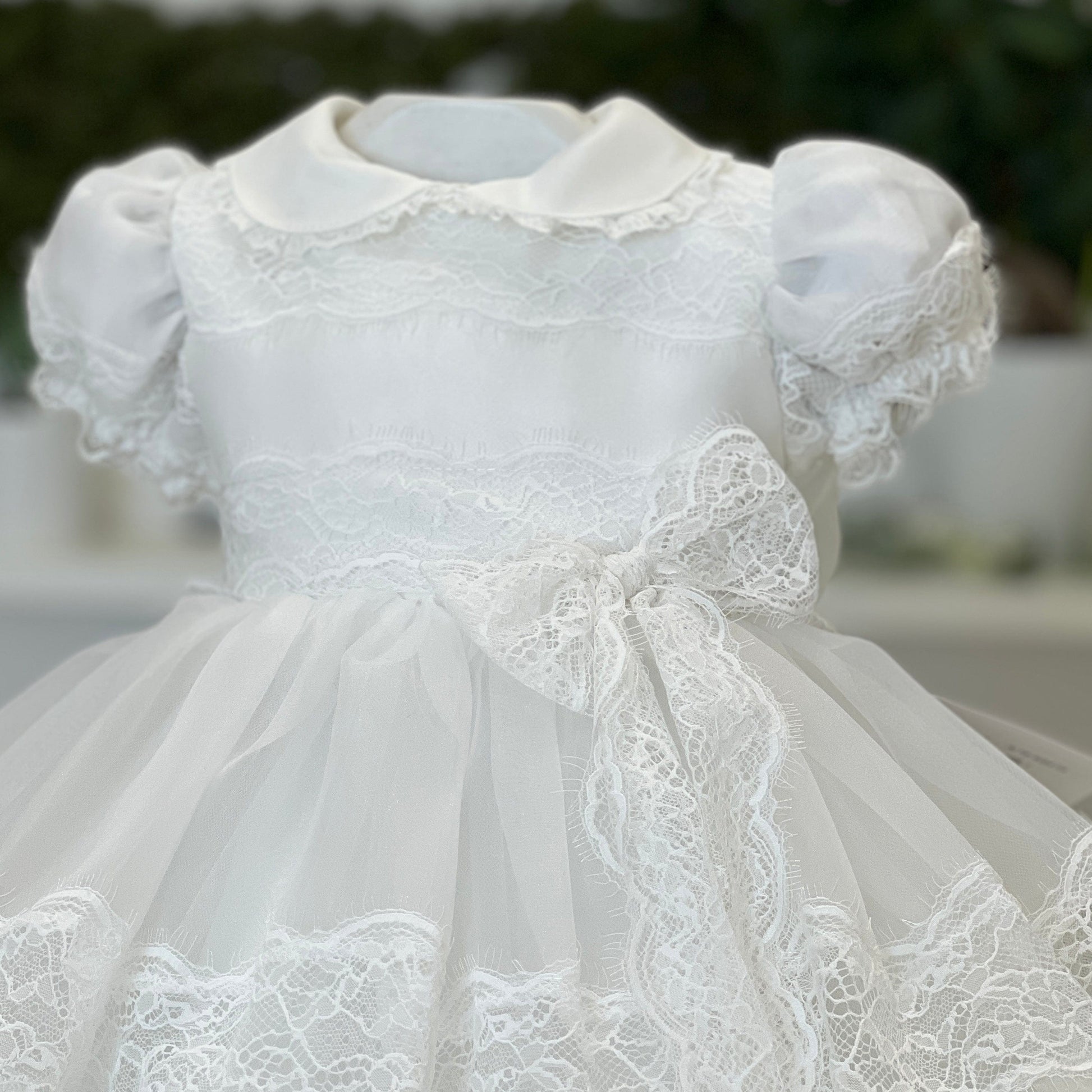 Abito battesimale in tulle con inserti in pizzo, caratterizzato da corpino con colletto tondo e maniche a sbuffo rifinite in pizzo. La gonna ampia e leggera presenta balze in tulle decorate da fasce di pizzo e un fiocco laterale in coordinato. Inclusi manicotti e culotte copripannolino.