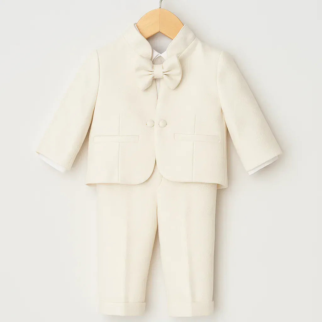 Completo elegante per neonato composto da camicia con colletto classico, papillon tono su tono e giacca panna con bottoni rivestiti e taschini a filetto. I pantaloni coordinati, con risvolto al fondo, completano l’insieme con un’eleganza essenziale e impeccabile. Una proposta raffinata, perfetta per cerimonie e occasioni speciali.
