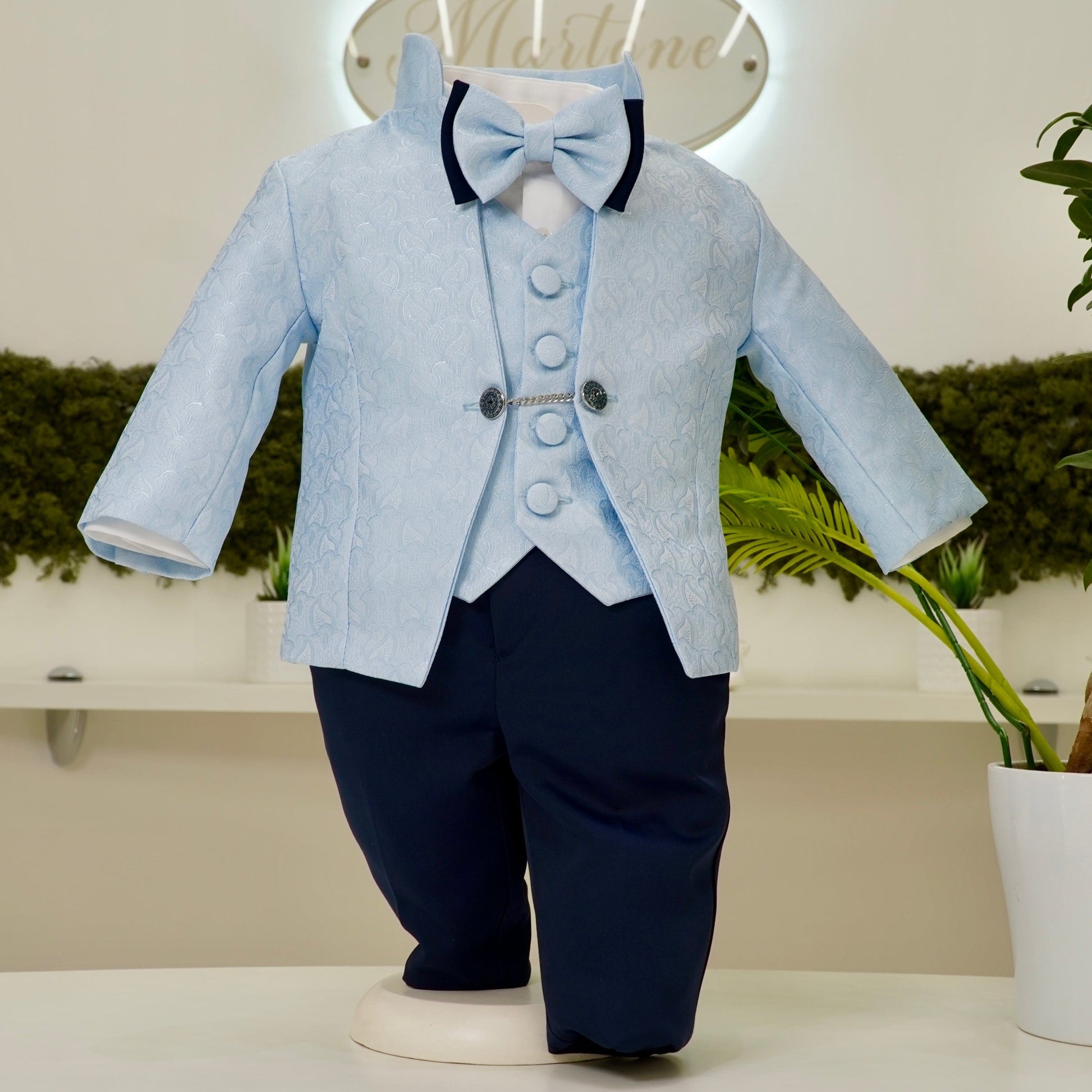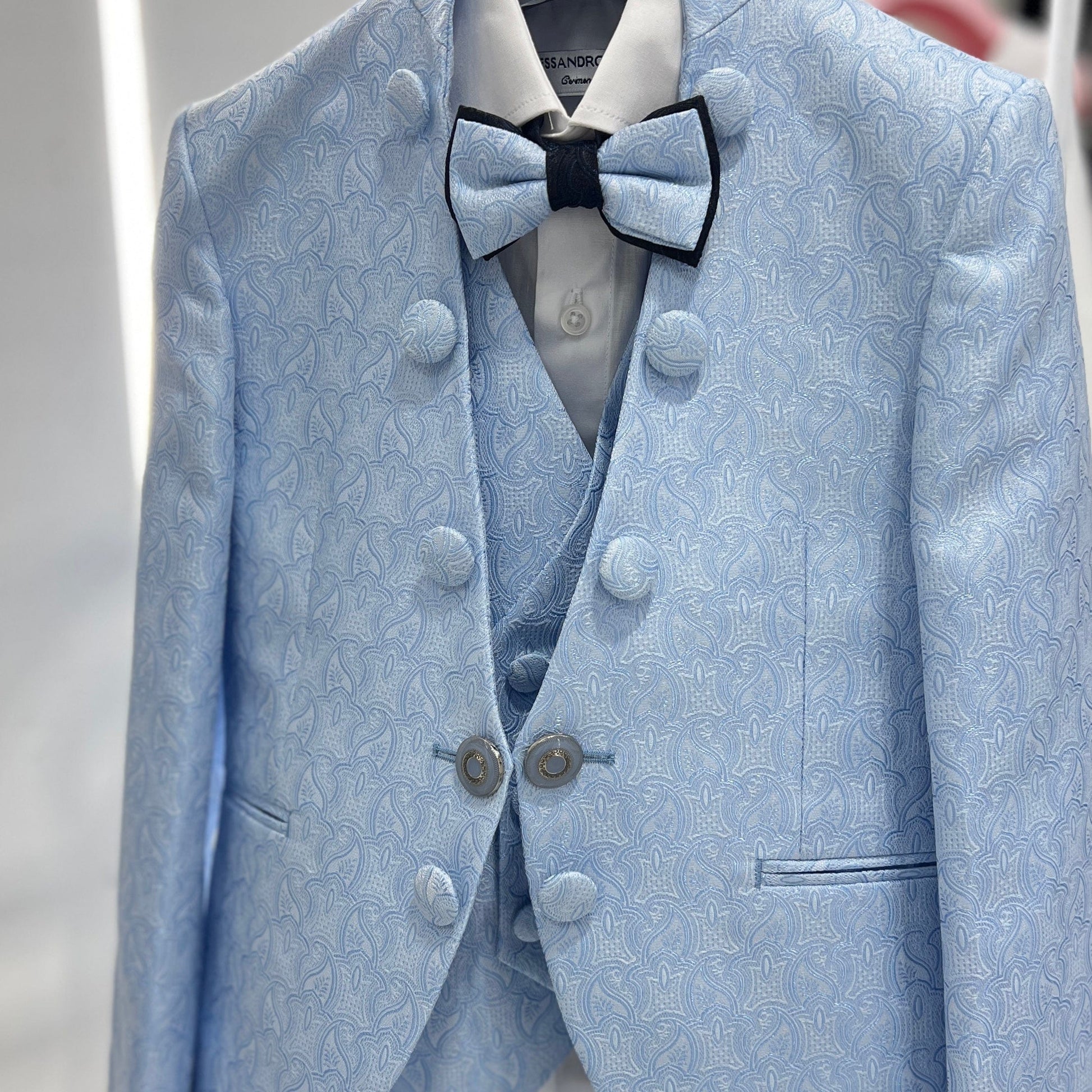 Abito da cerimonia composto da giacca modello coreana in tessuto damascato con bottoni laterali, gilet damascato e pantalone a contrasto blu. Papillon bicolore coordinato e camicia in cotone bianca.