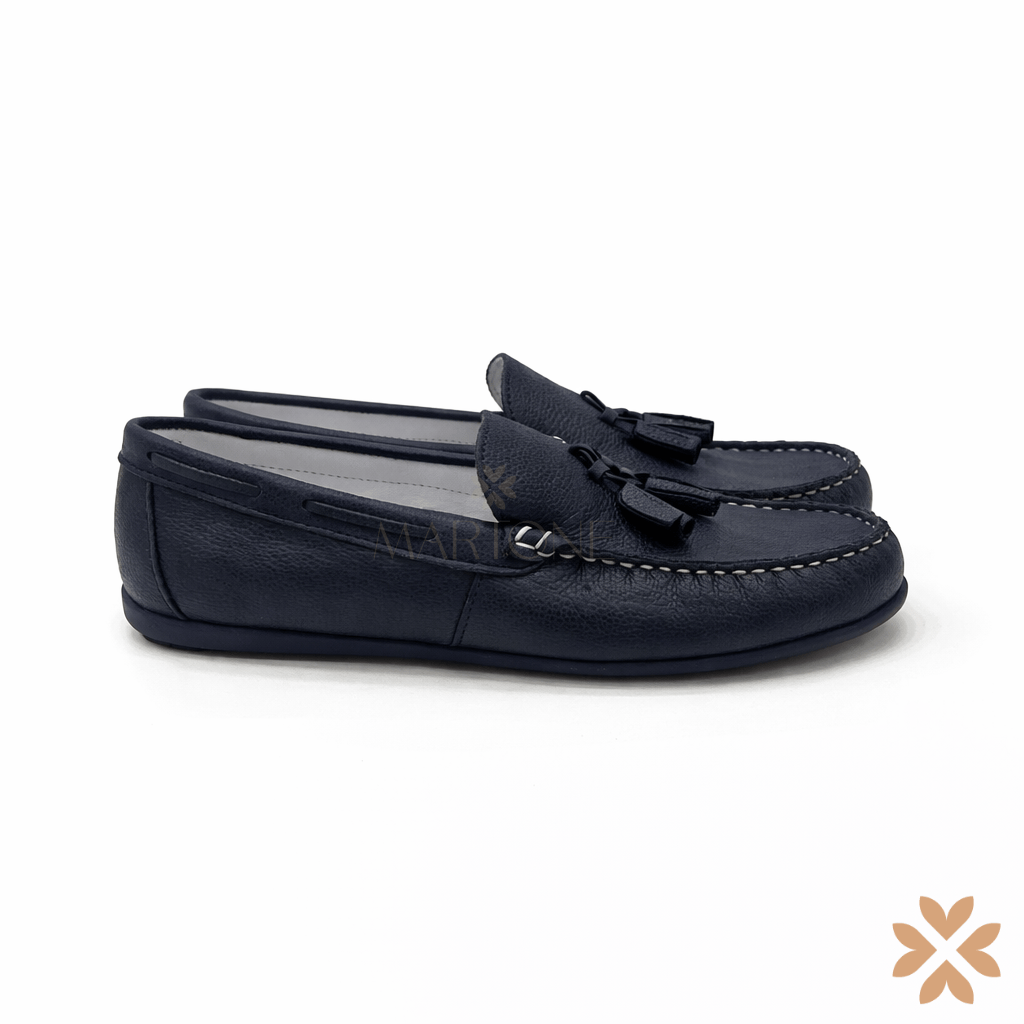 Mocassino bimbo in elegante tonalità blu, con raffinati dettagli con nappine e design classico. Plantare anatomico e suola antiscivolo garantiscono comfort e stabilità. Modello versatile, ideale per look curati tra cerimonia e casual elegante.