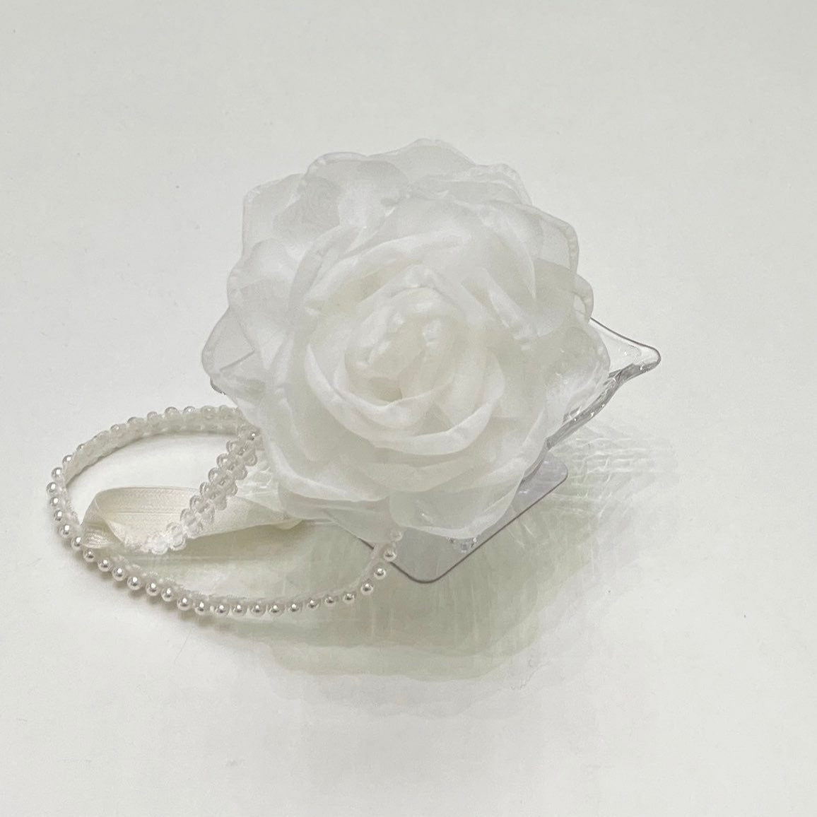 Fascia neonata con elastico sul retro, impreziosita da perline e fiore in organza.