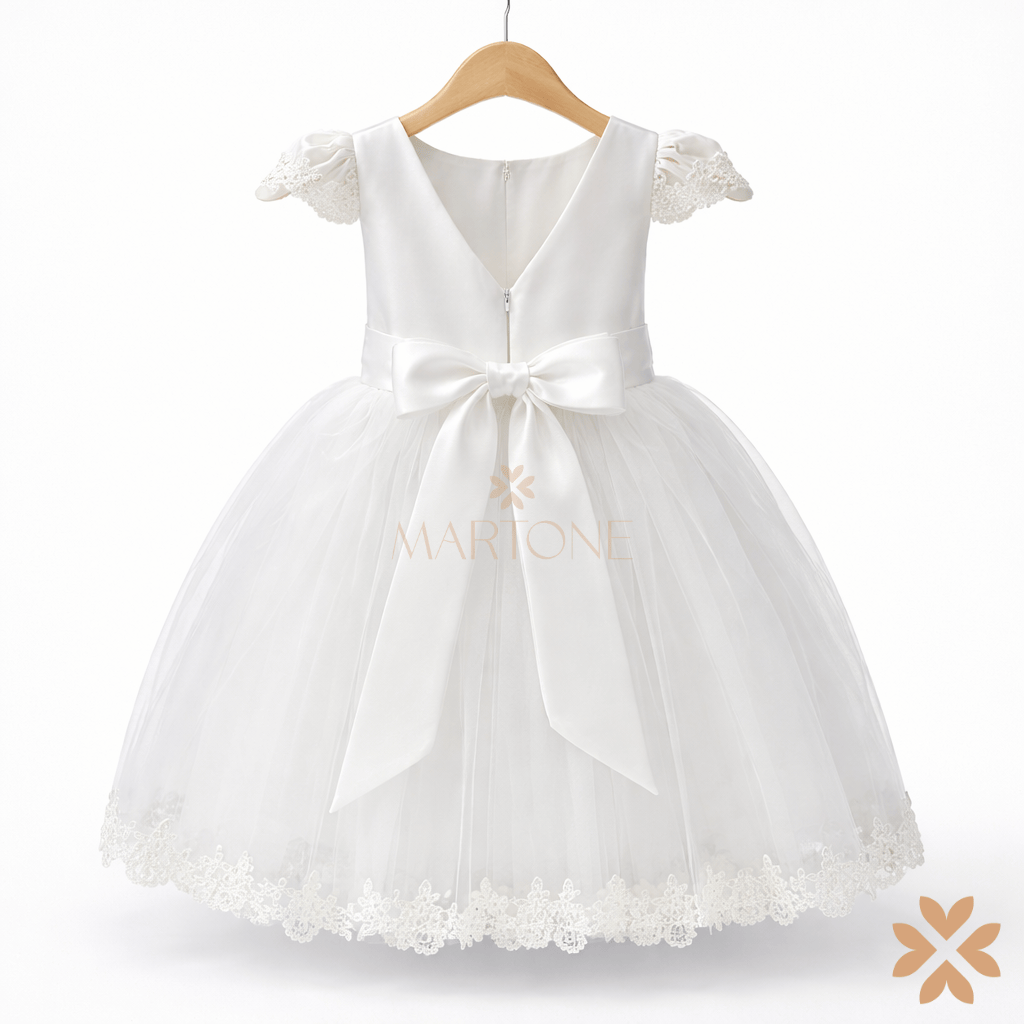 Abito sartoriale da cerimonia realizzato con corpino in mikado dalla mano liscia e struttura pulita. Scollo a V sul davanti e sul retro, rifinito con chiusura centrale invisibile. Manica ad aletta corta in tulle con applicazioni in pizzo ricamato. Gonna ampia in tulle morbido con sottogonna strutturata per garantire volume e leggerezza, rifinita al fondo con ricamo floreale in pizzo. Fascia in raso in vita con fiocco importante applicato sul retro.