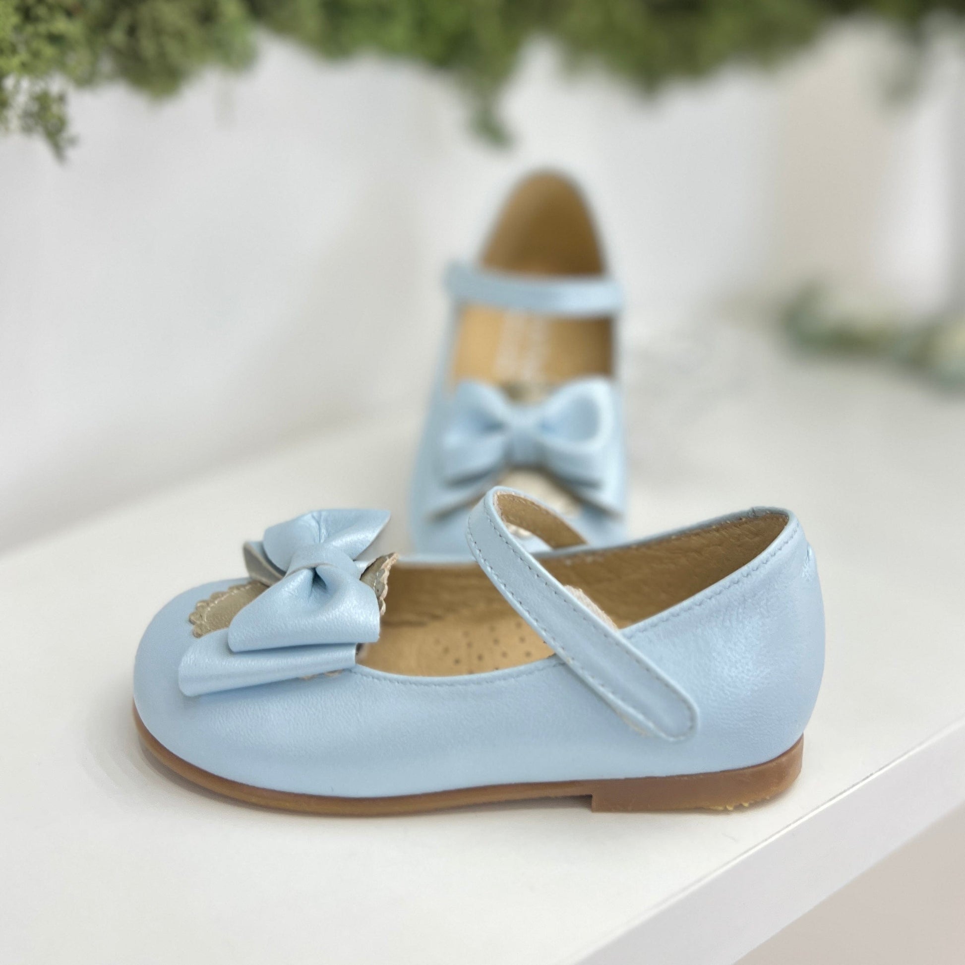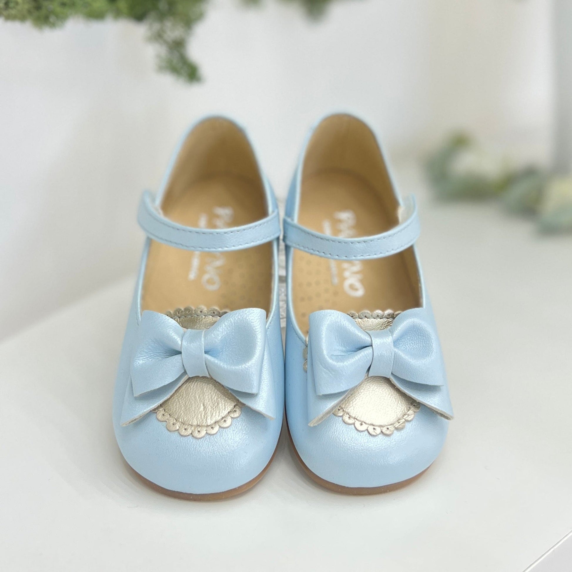 Ballerina in pelle celeste con fiocco, cinturino alla caviglia con fiocco, suola antiscivolo e plantare anatomico.