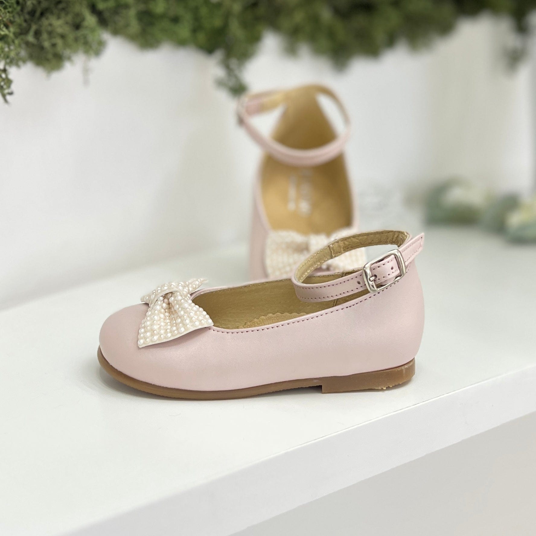 Ballerina bimba in pelle con cinturino alla caviglia e fiocco di perline, elegante e raffinata, ideale per cerimonie e momenti speciali.