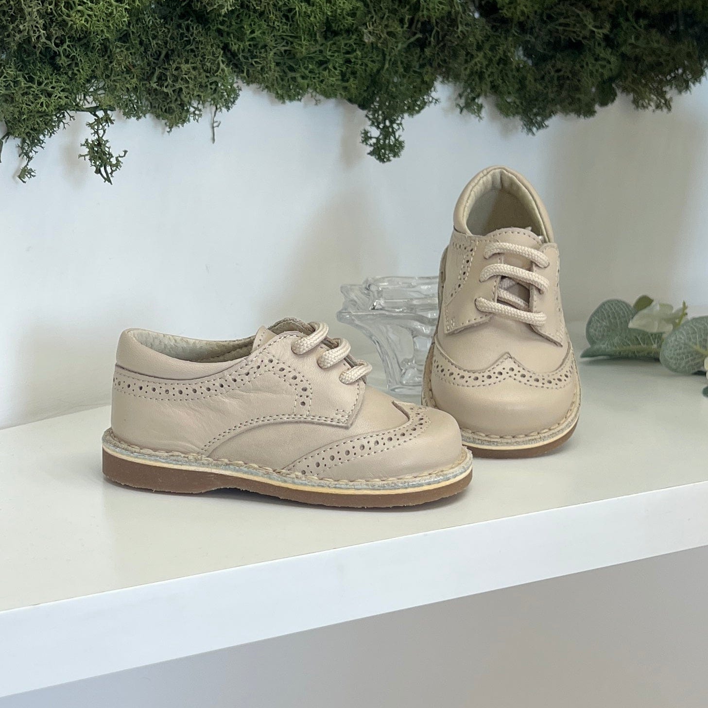 Francesina bimbo in pelle beige con trafori ed impunture, suola in gomma antiscivolo.