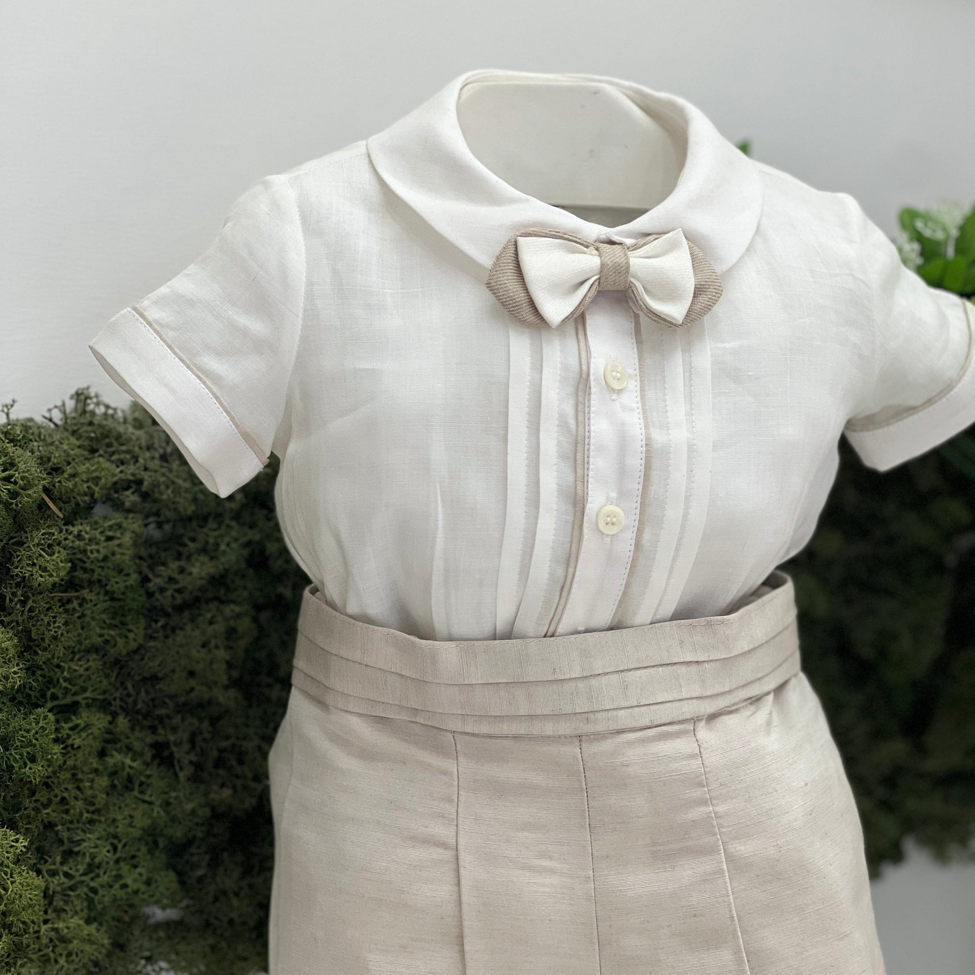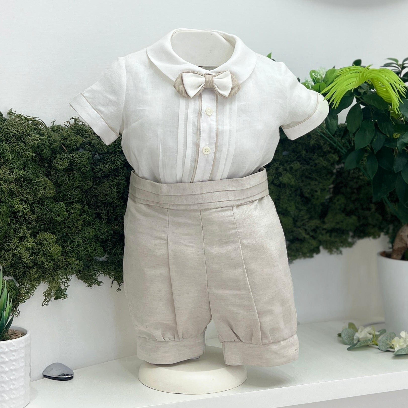 Abito battesimale elegante in lino, composto da pantaloncini con fascia in vita, camicia con pieghe sul davanti e papillon coordinato. Raffinato e fresco, perfetto per un'occasione speciale.