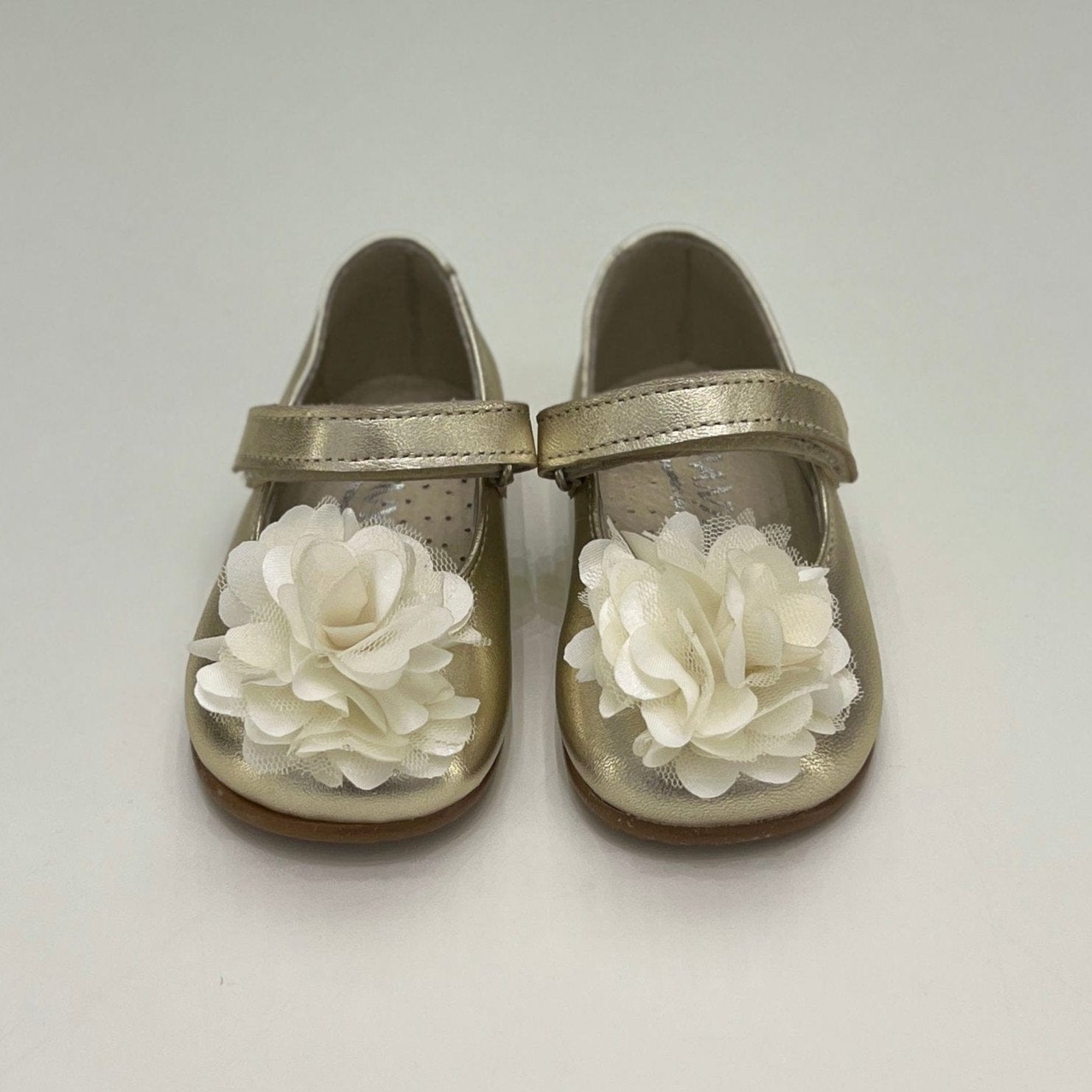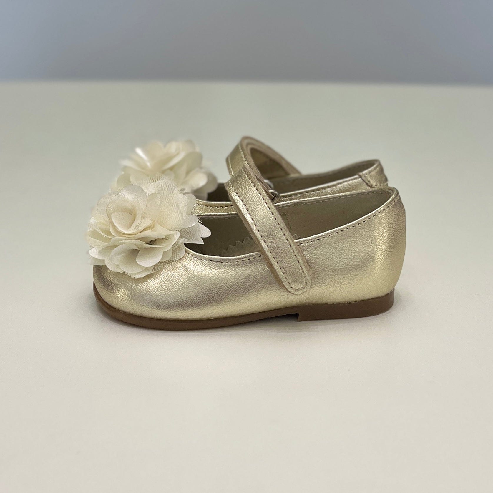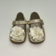 Ballerina in pelle laminata color champagne con fiore.