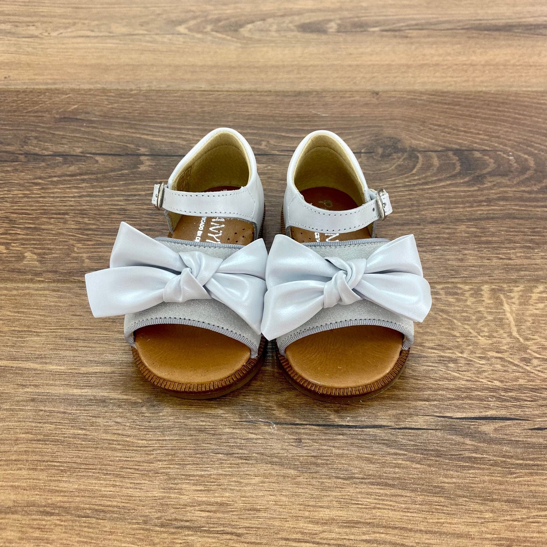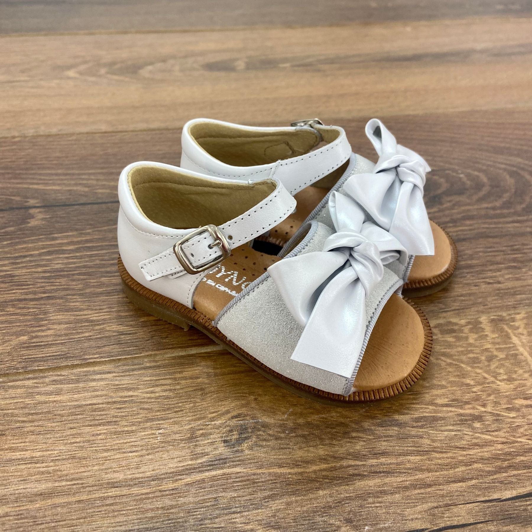 Sandoletto in pelle con fascia glitter e fiocco.