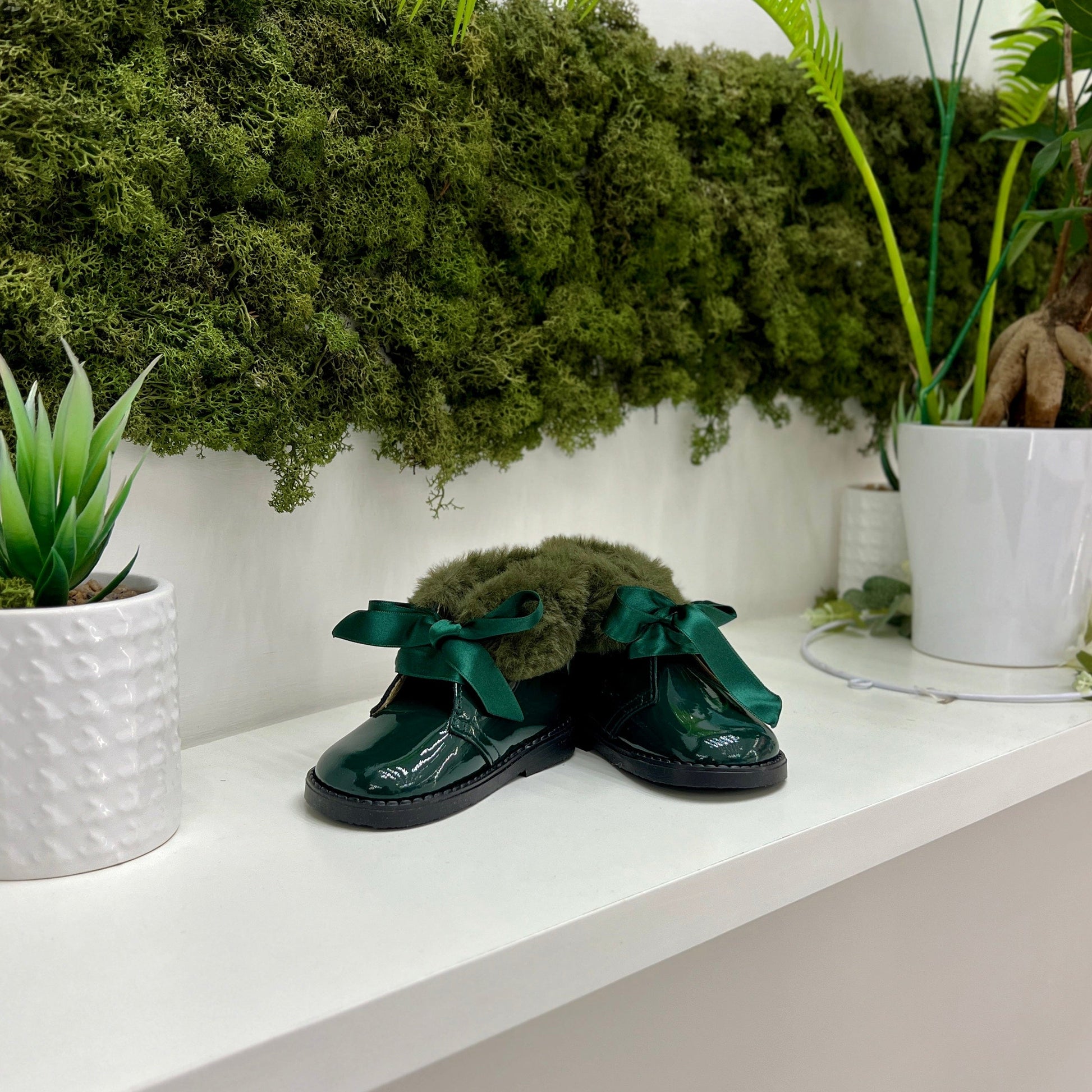 Stivaletto lucido con pelliccetta e fiocco in raso.