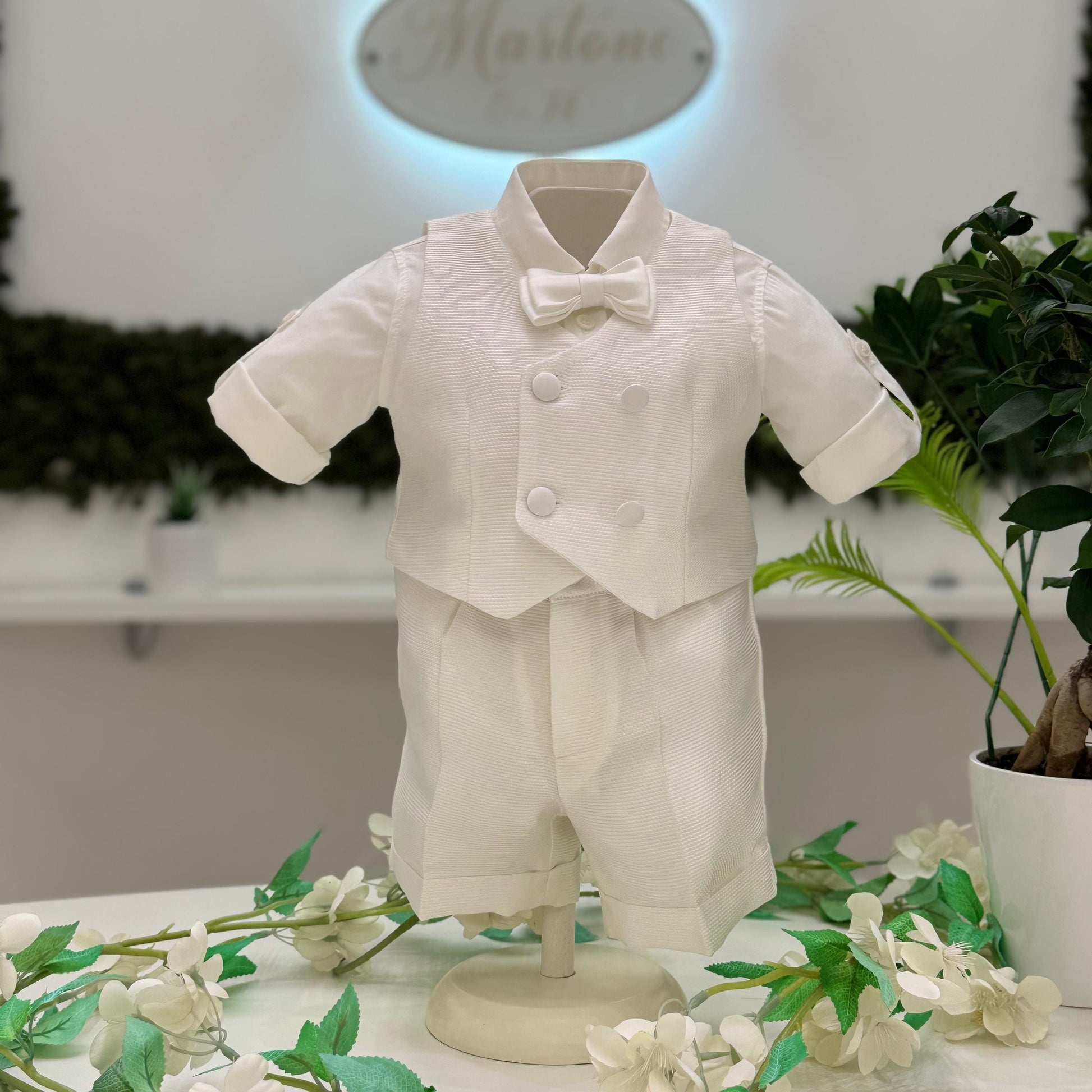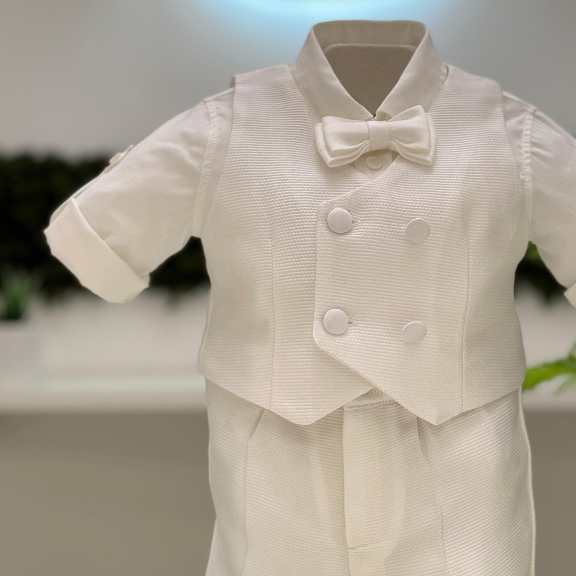 Un completo in cotone operato che incarna l’eleganza: gilet sartoriale, bermuda dal taglio impeccabile, papillon sofisticato e camicia con body integrato per il massimo del comfort. Un look che lascia il segno, perfetto per i momenti più speciali.