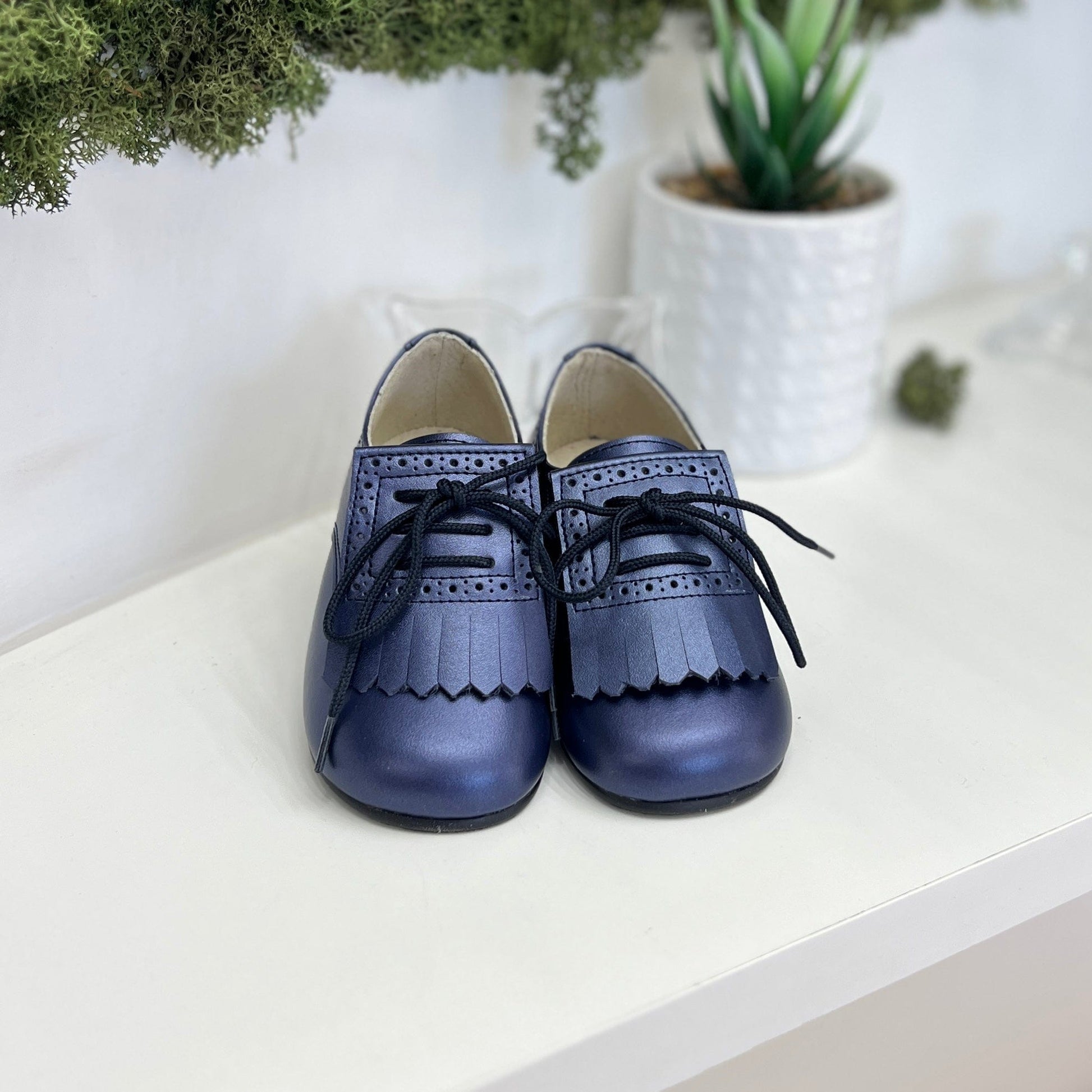 Scarpine in morbida pelle blu perlato con frangia frontale e dettagli traforati. Dotate di plantare anatomico e suola antiscivolo, uniscono eleganza e comfort in ogni passo. Perfette per completare con stile gli outfit da cerimonia.