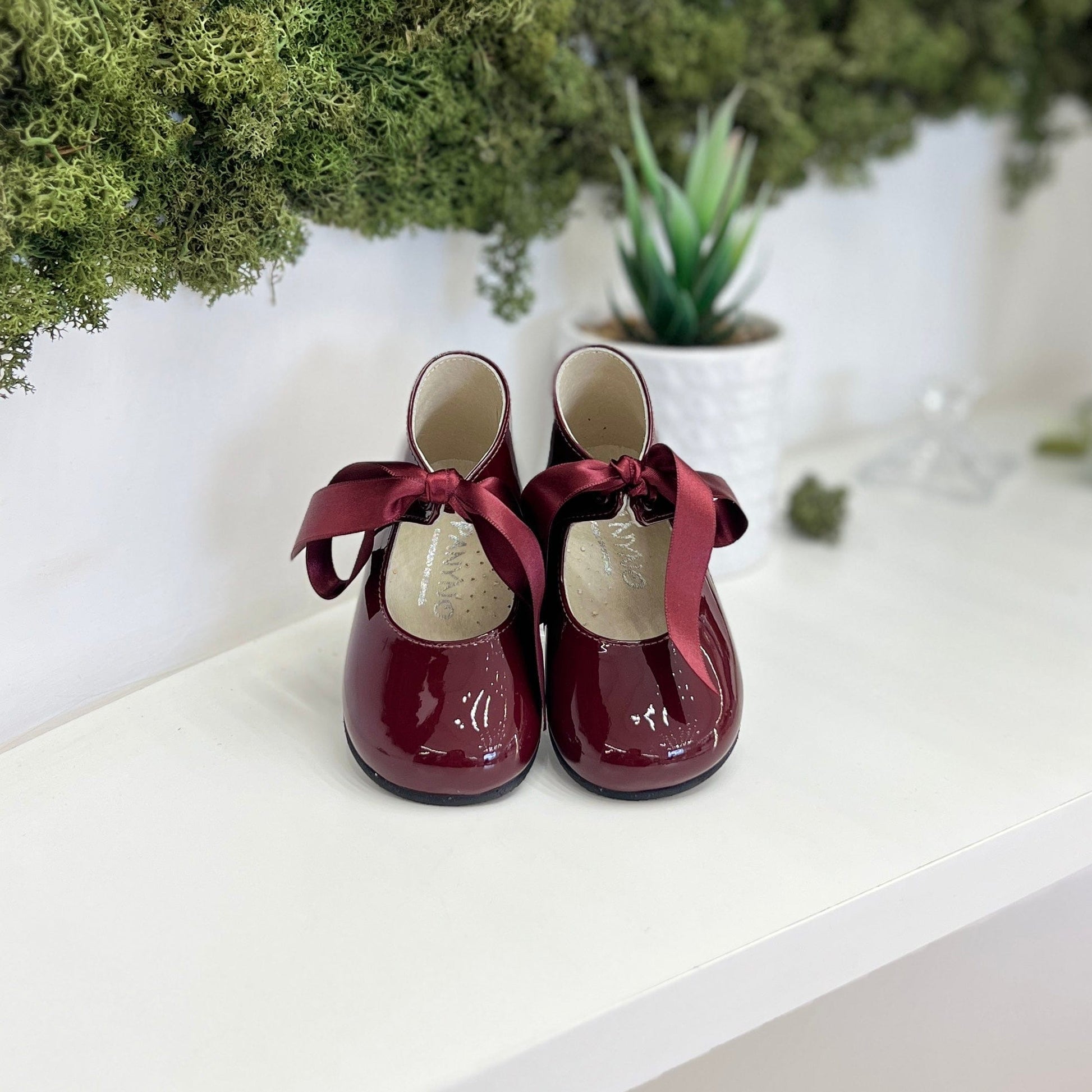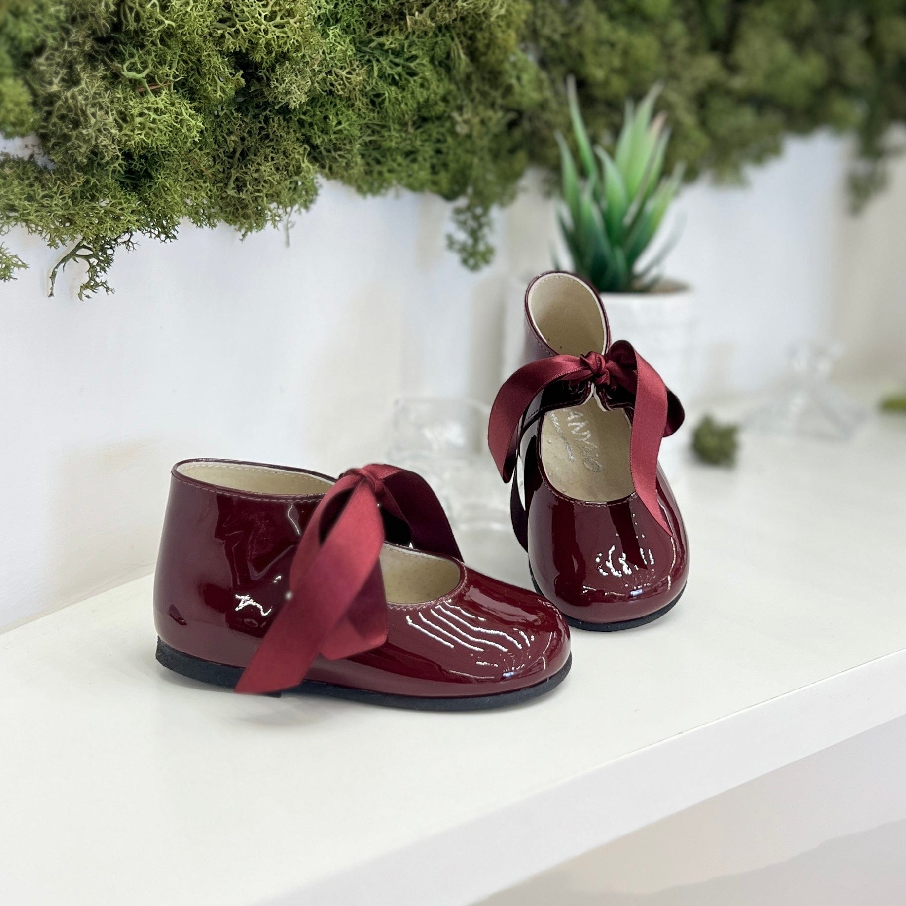 Scarpine in vernice bordeaux con chiusura a fiocco in raso, plantare anatomico e suola antiscivolo. Eleganti e raffinate, ideali per completare gli outfit da cerimonia.