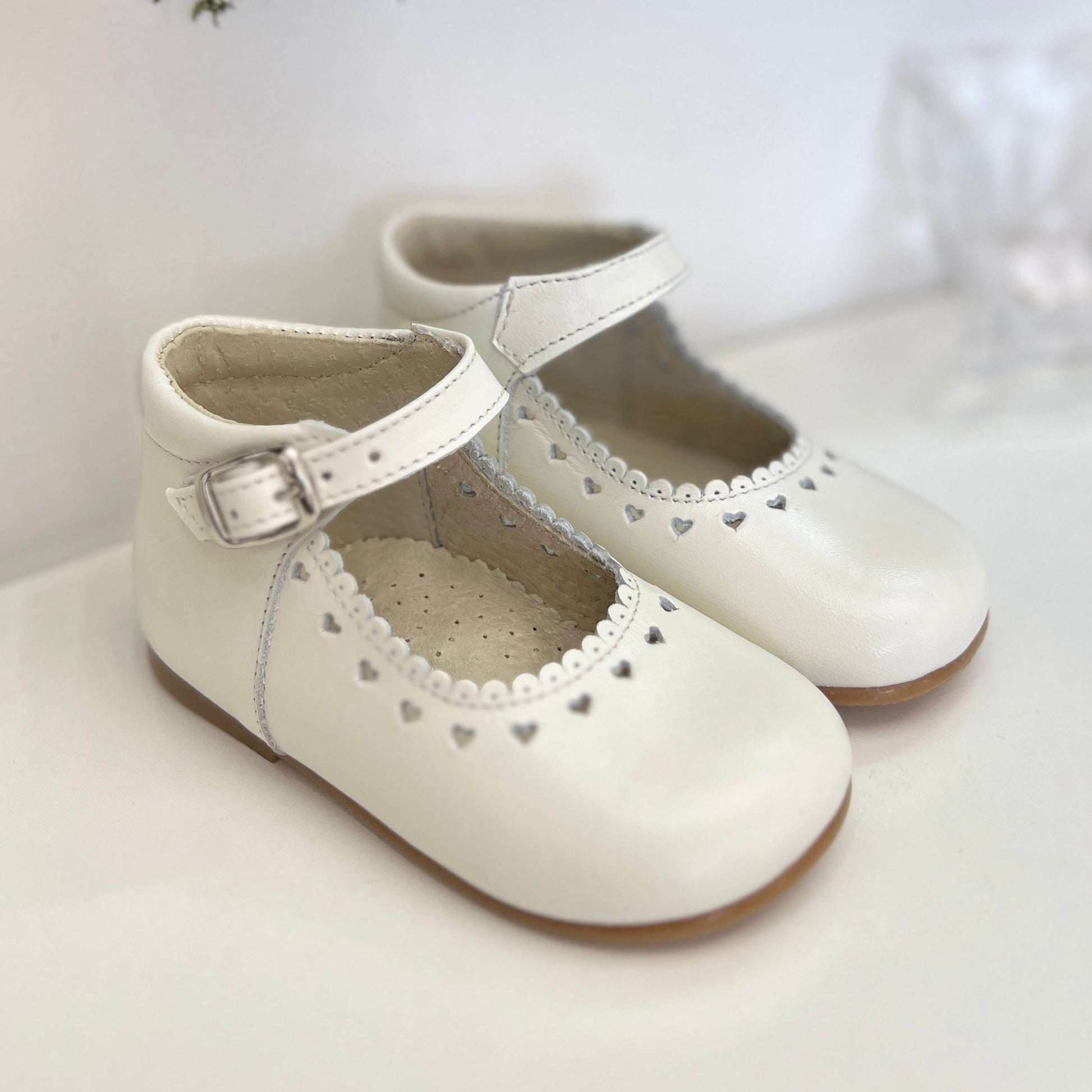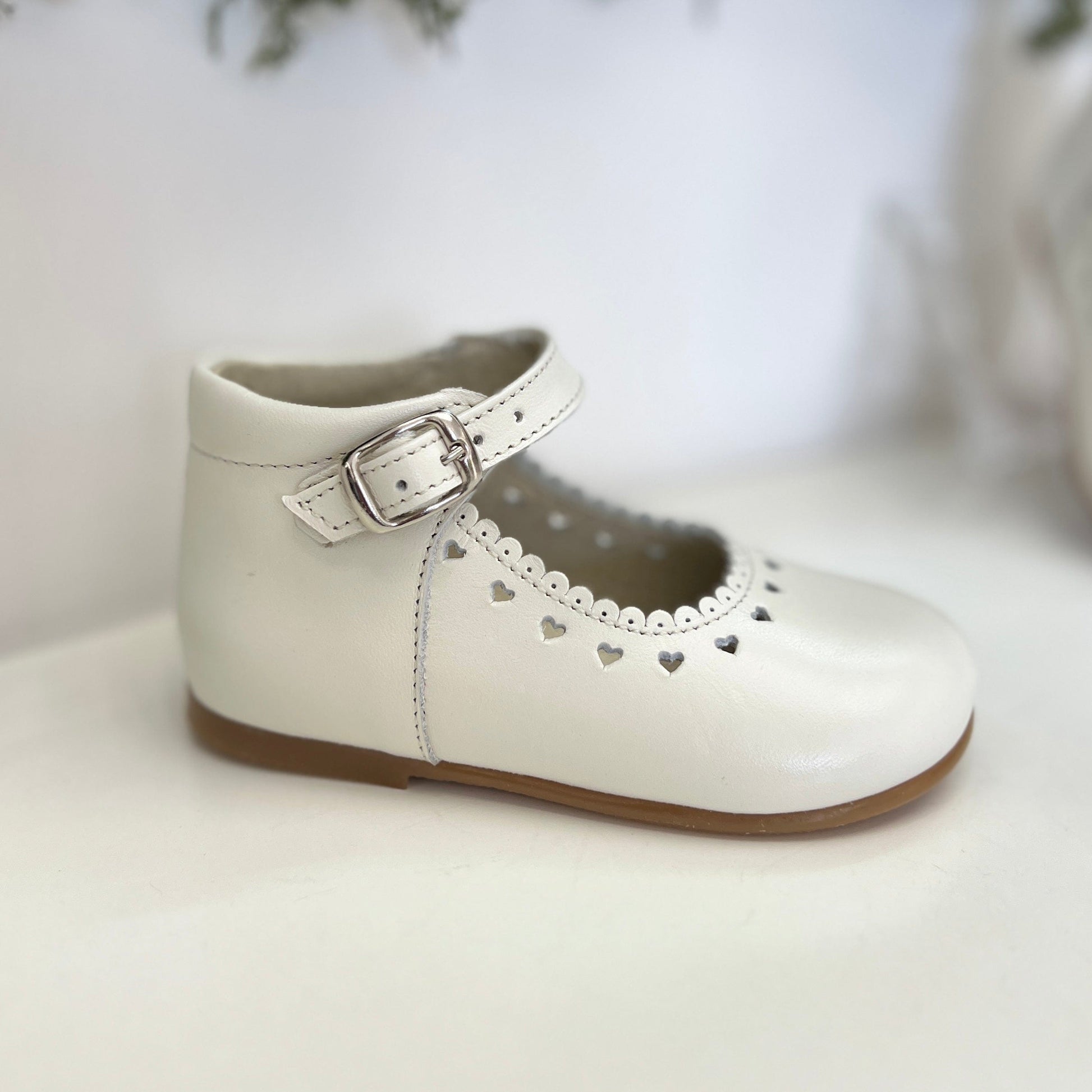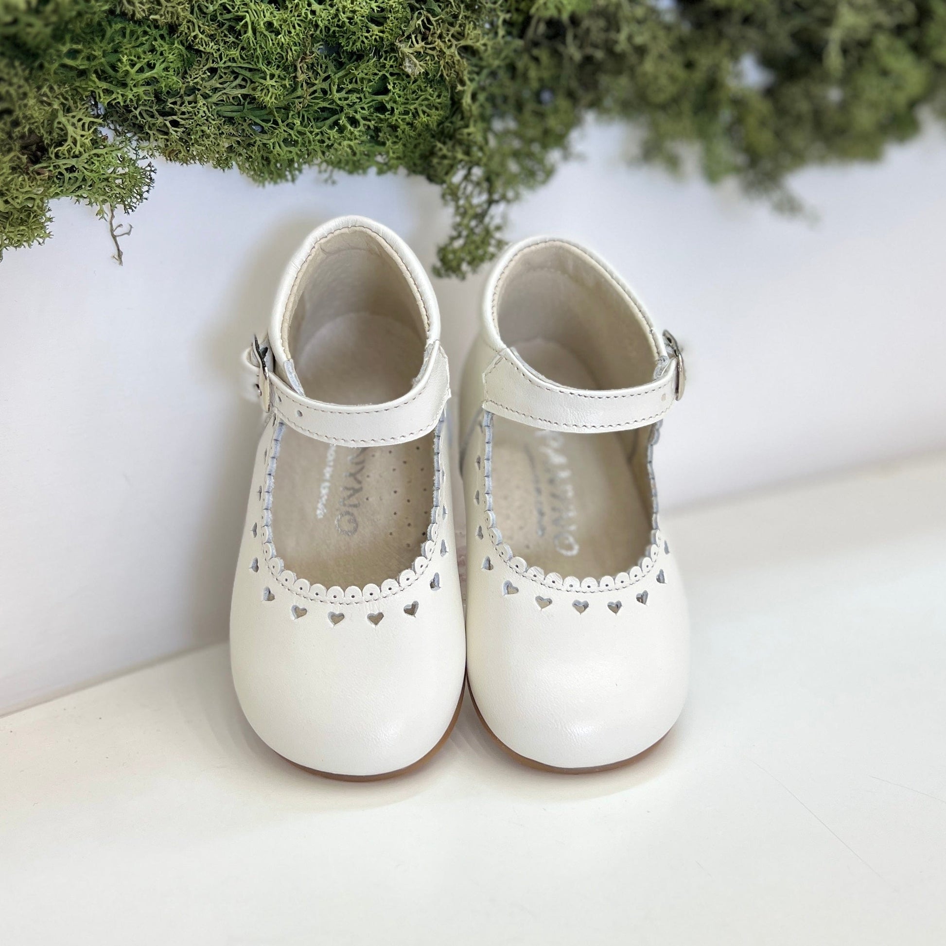 Ballerina in pelle con cinturino, cinturino alla caviglia con fibbia regolabile plantare anatomico suola antiscivolo, dettaglio traforato con cuori.