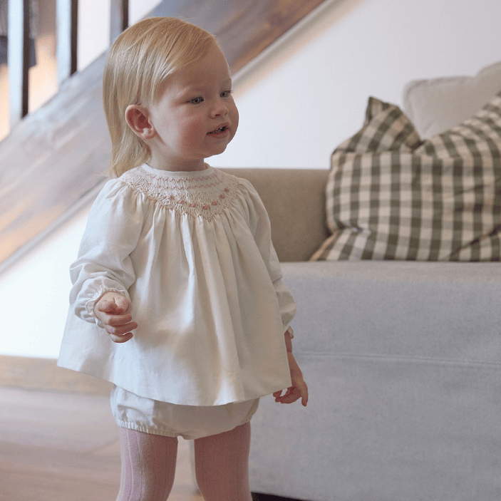 Completo due pezzi in cotone composto da blusa con ricamo smock realizzato a mano e culotte coordinata. La blusa, dalla linea morbida, presenta maniche lunghe con laccetti al polso e delicati ricami di roselline nei toni del rosa. Chiusura sul retro con bottoni. Un modello classico e raffinato, ideale per le occasioni speciali.