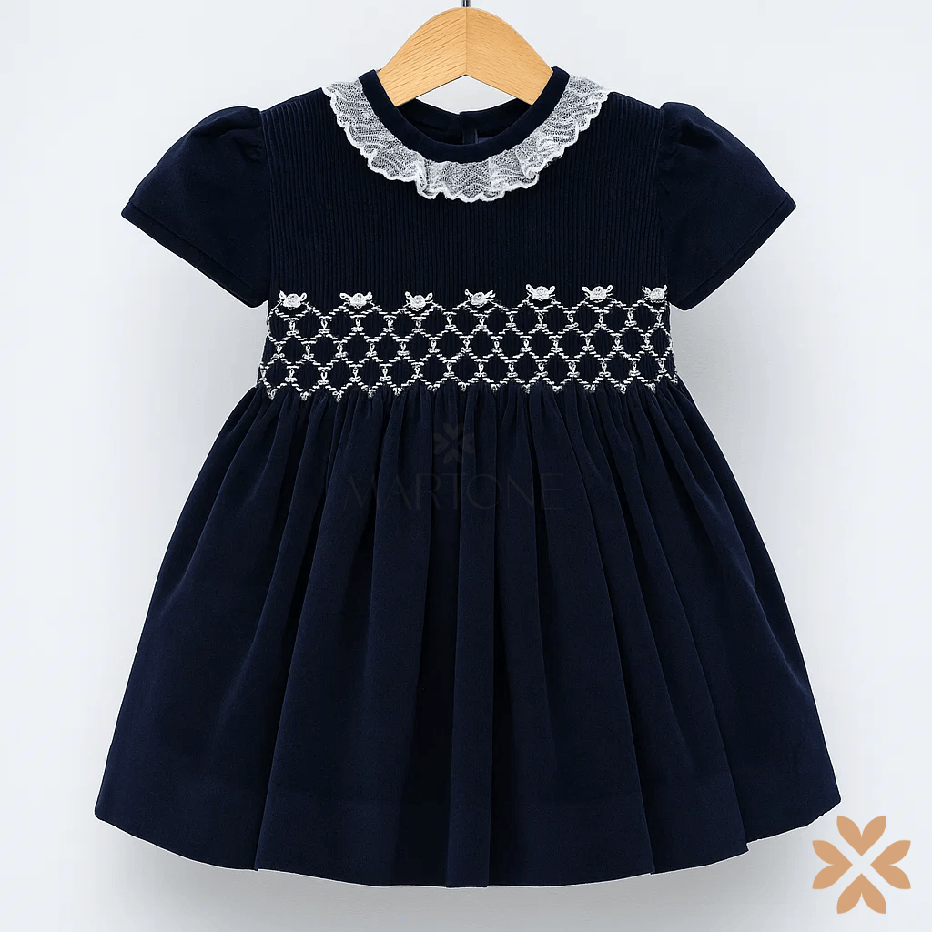 Abito blu notte in velluto millerighe di cotone, un tessuto compatto e strutturato che esalta la linea classica del modello. Il corpino con ricamo smock realizzato a mano e piccoli fiocchi in rilievo si unisce al colletto in pizzo, per un’eleganza dal fascino bon-ton. Chiusura sul retro con bottoni e cintura con fiocco che completa il look con raffinatezza.
