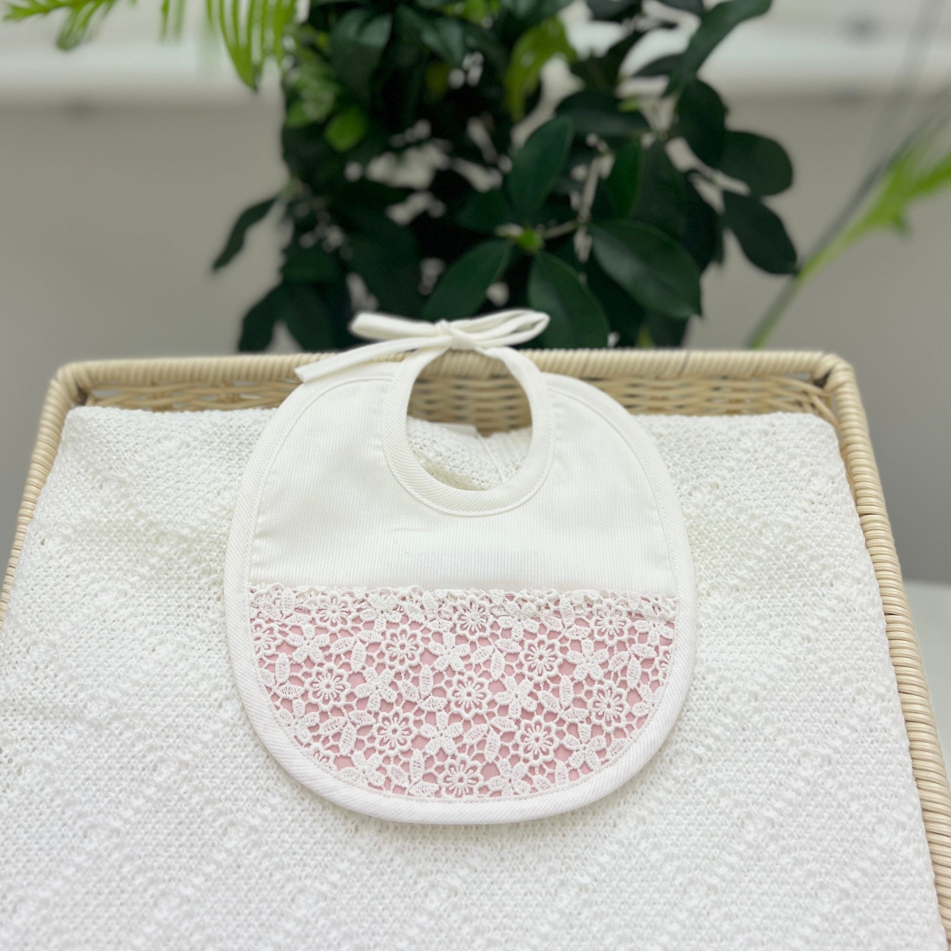 Bavetta in lino con dettaglio in macramé e fiore applicato. Un accessorio elegante e pratico, che unisce funzionalità e raffinatezza, perfetto per completare il look del neonato con un tocco di delicatezza e stile.