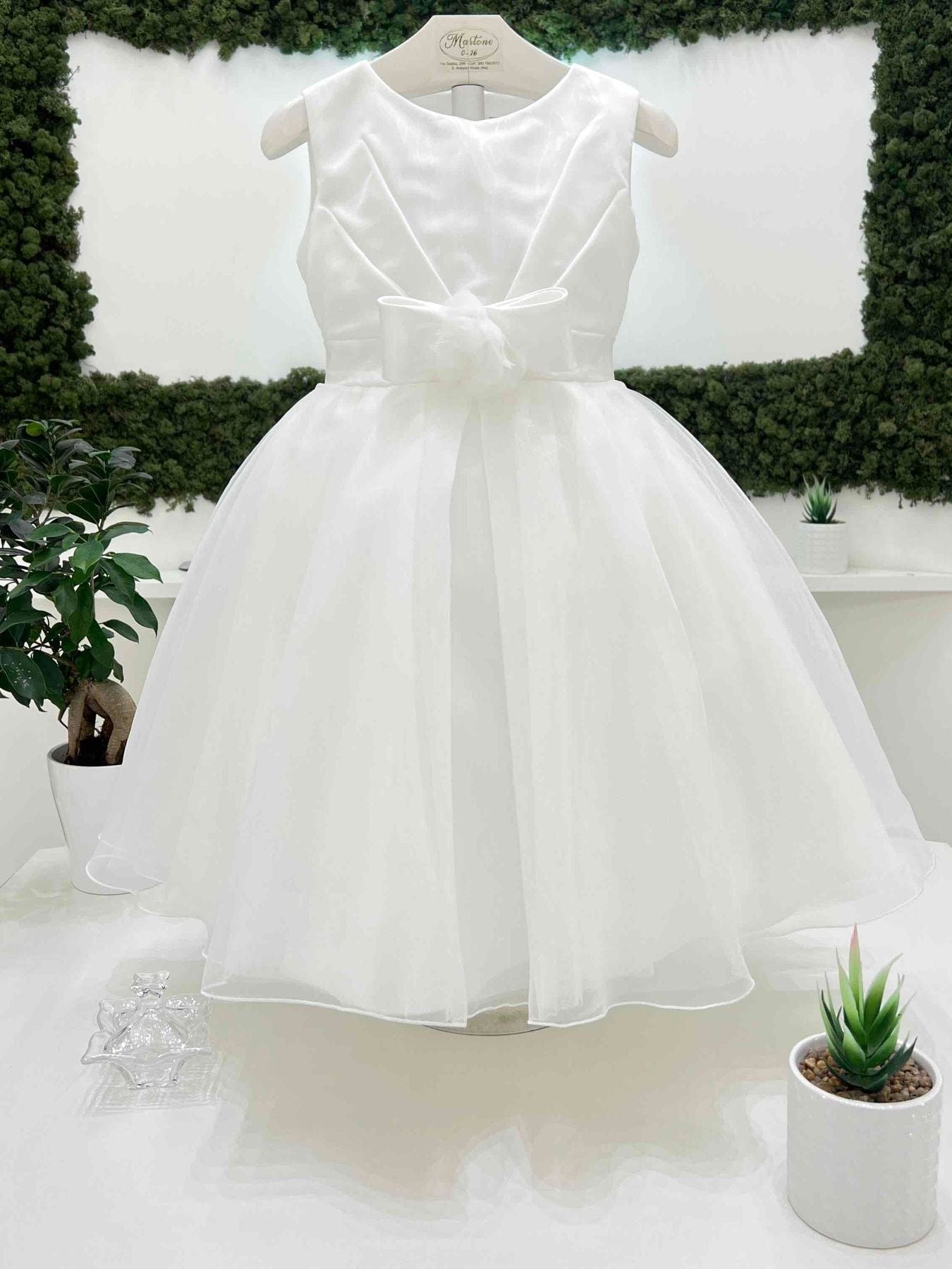Abito cerimonia bimba in mikado, foderato con organza sul corpetto. Gonna in organza e fiocco sul retro, spilla removibile con dettaglio floreale sul davanti.
