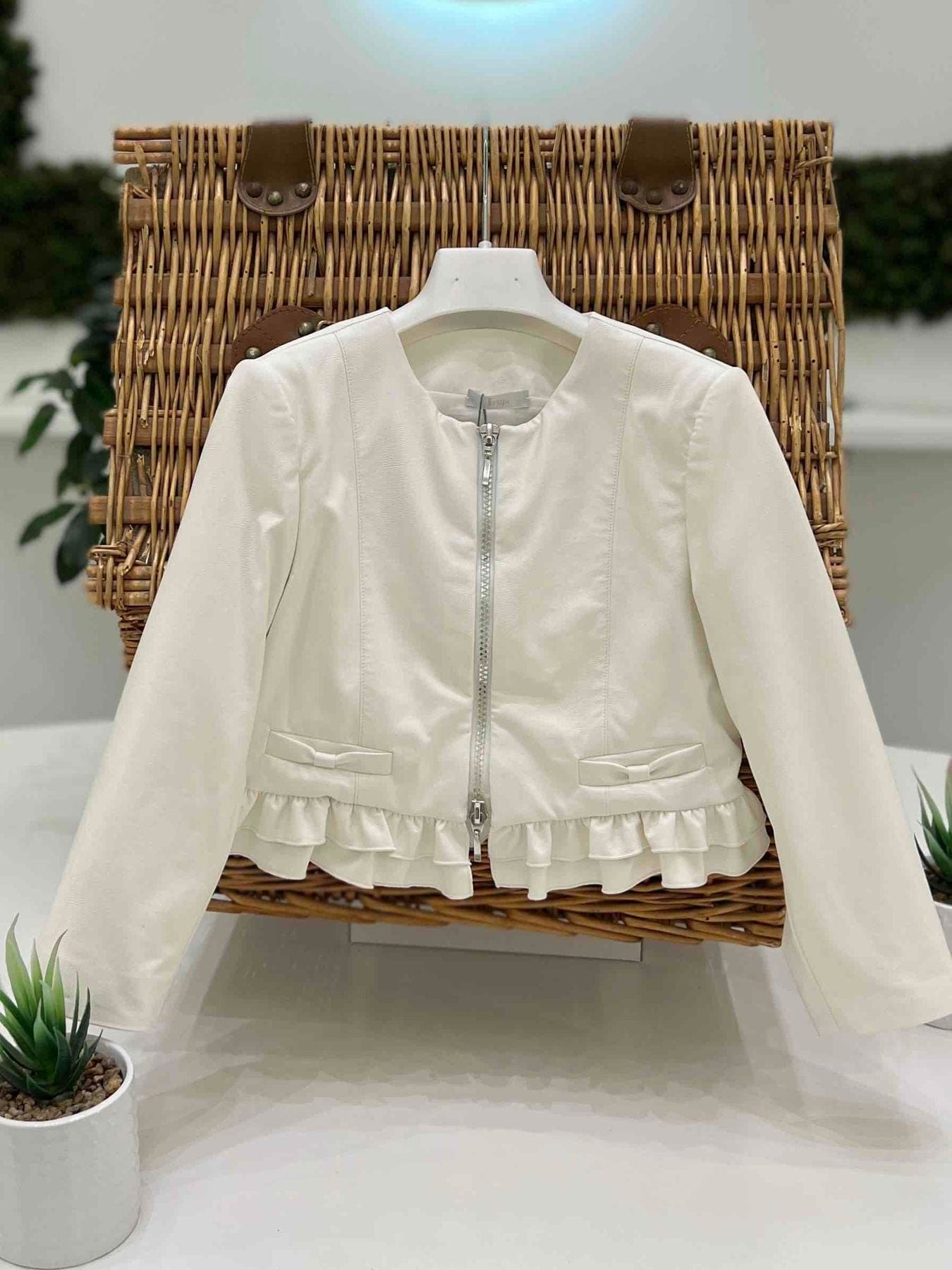 Giubbotto mezza stagione in ecopelle con rouches sull'orlo.