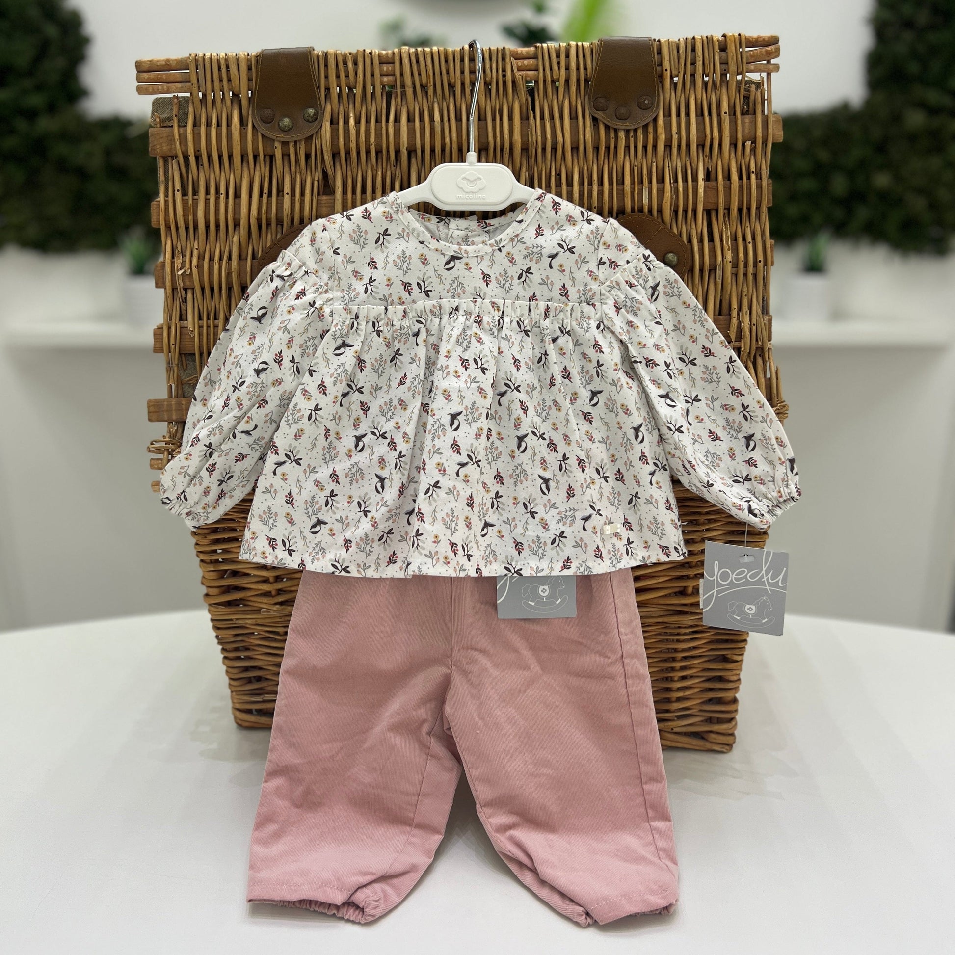 Completo due pezzi con blusa fantasia floreale e pantalone in caldo cotone rigato.