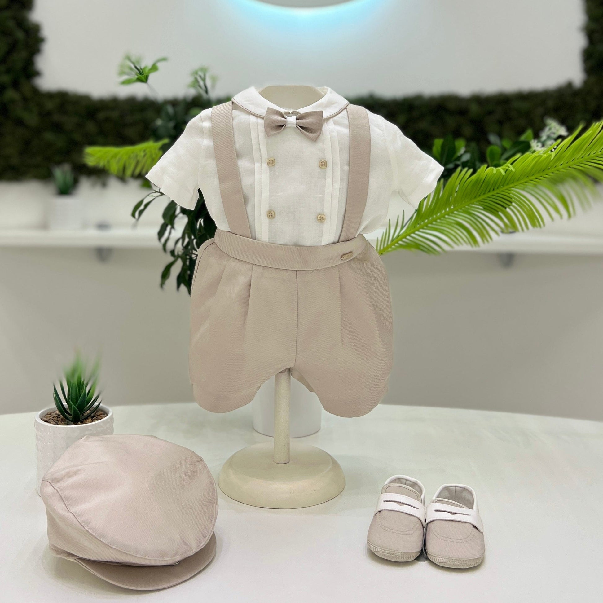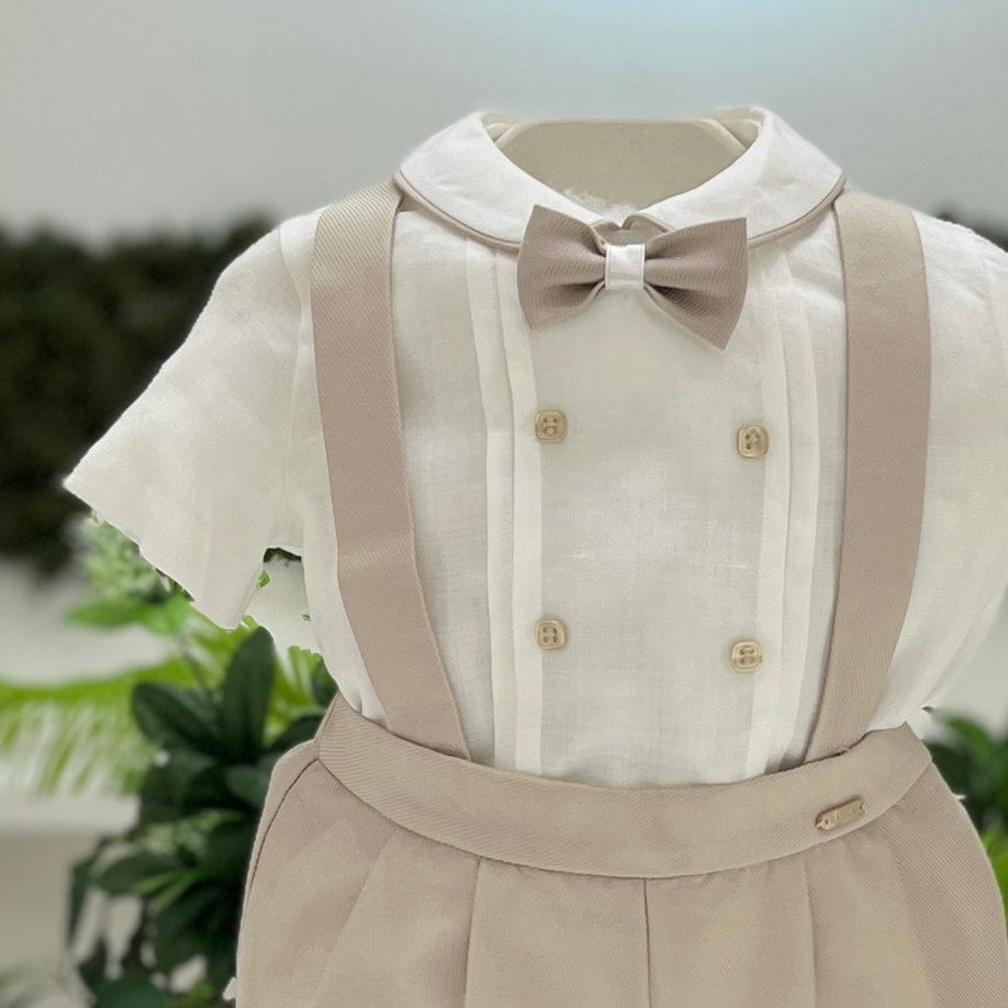 Elegante completo battesimale composto da pantaloncini con bretelle in tessuto operato, per un tocco di classe e raffinatezza. La camicia body a manica corta in lino garantisce comfort e freschezza, mentre il colletto bordato a contrasto aggiunge un dettaglio sofisticato. Completano il look un raffinato papillon, per un tocco finale di eleganza. Perfetto per il battesimo, un outfit semplice ma impeccabile.