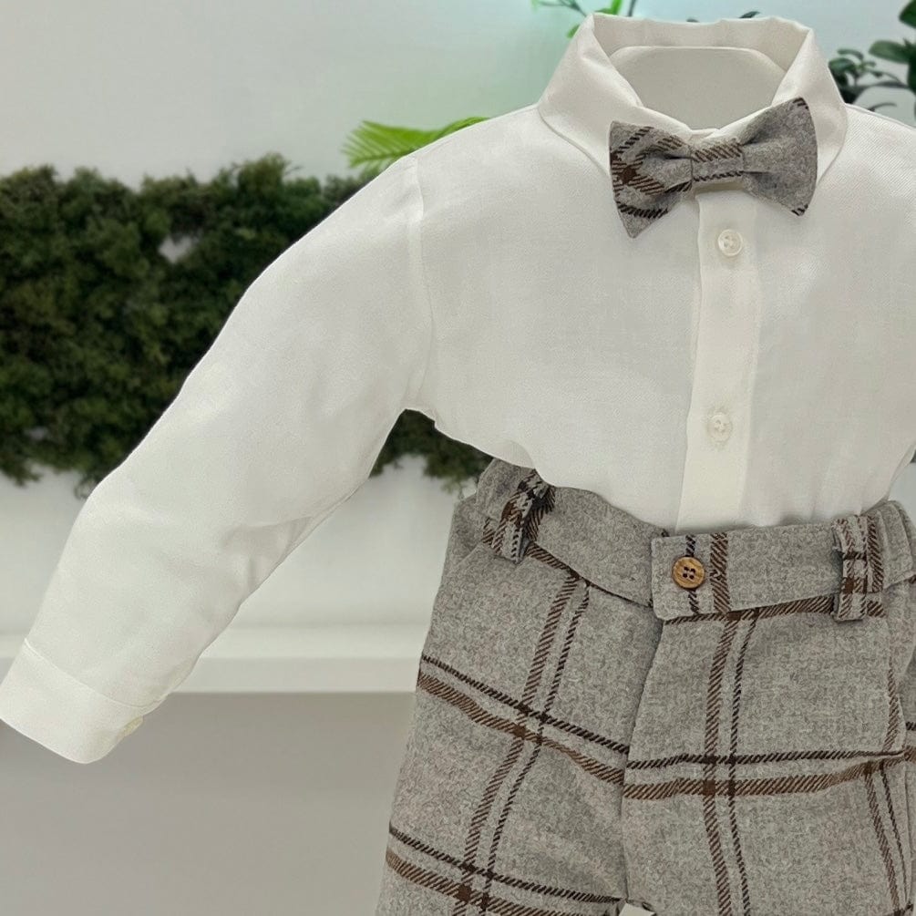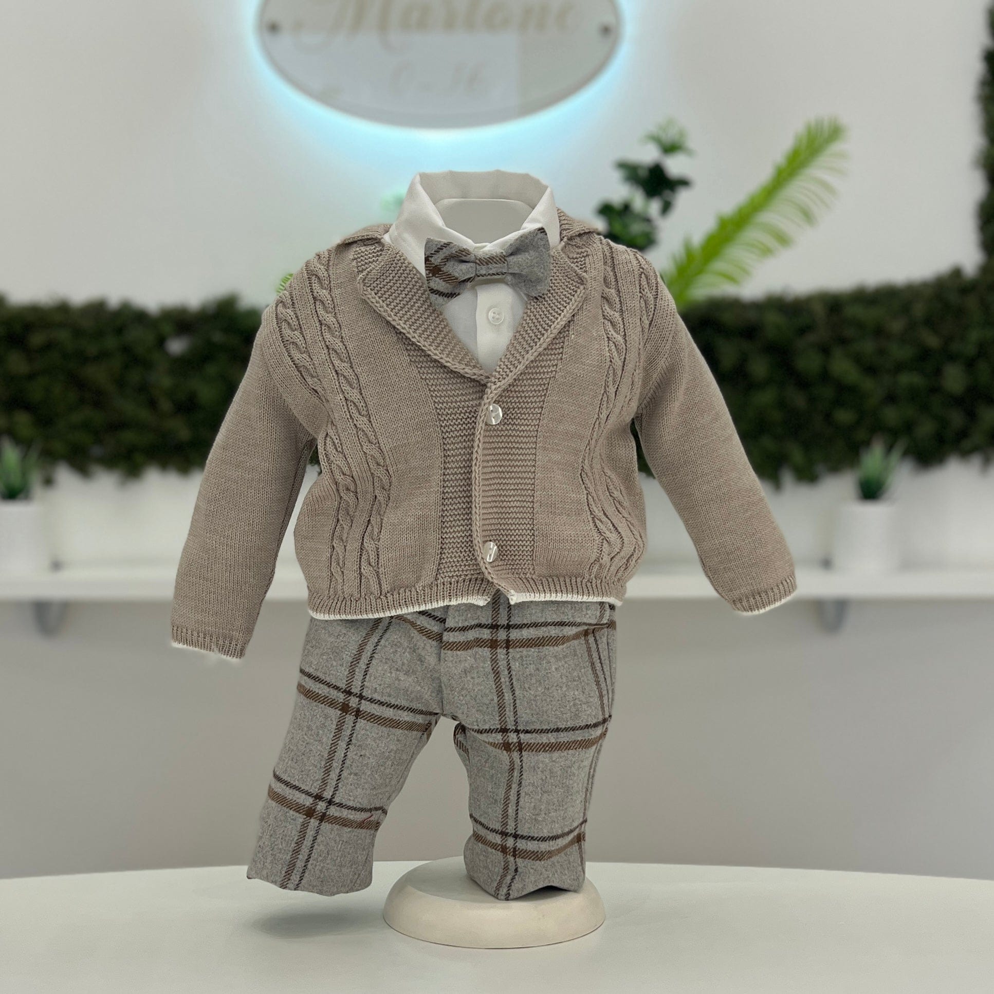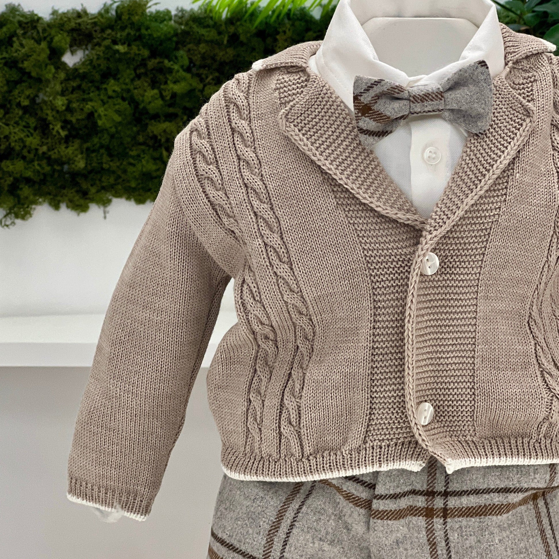 Completo elegante composto da pantalone lungo in panno a quadroni, cardigan in lana con lavorazione a trecce beige, camicia in cotone e papillon coordinato.