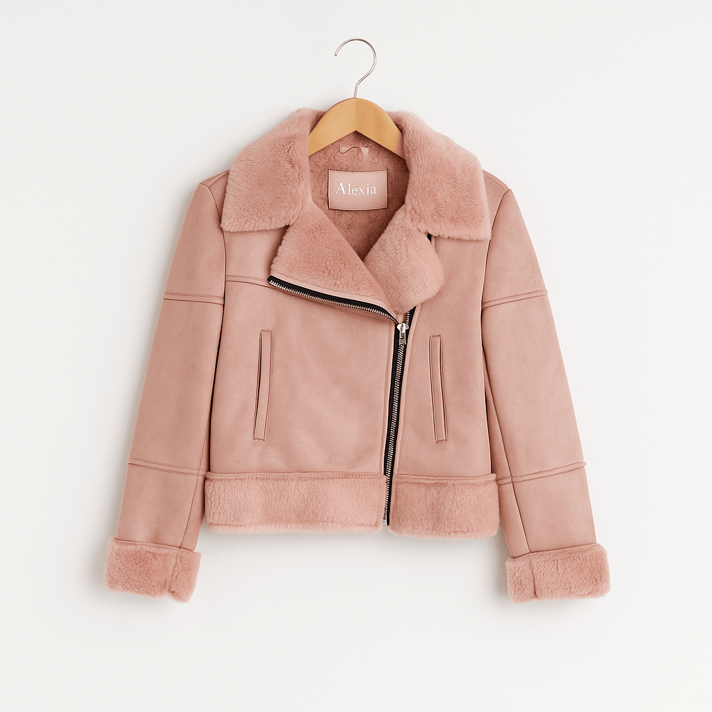 Giubbino in ecopelle scamosciata rosa, caratterizzato da interno, collo e polsini in morbida pelliccia ecologica tono su tono. Presenta chiusura laterale con zip metallica e tasche verticali. Un modello moderno e caldo, dal design essenziale e raffinato.