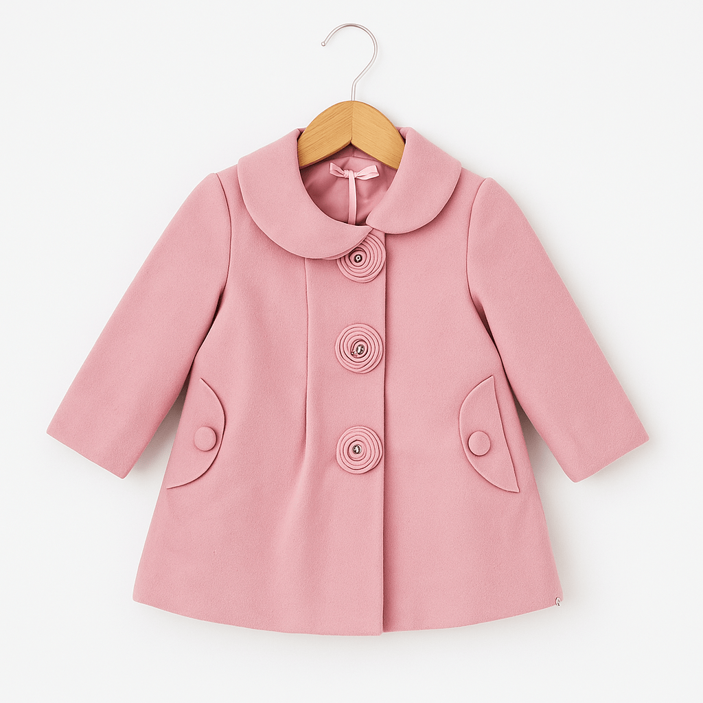 Cappottino rosa dalla linea svasata, impreziosito da grandi bottoni decorativi a fiore che donano un carattere delicato e raffinato. Il colletto tondo aggiunge un’eleganza classica, mentre le taschine frontali con pattina e bottone completano il design. Un modello dolce e curato nei dettagli, perfetto per le occasioni speciali e per un look impeccabile.