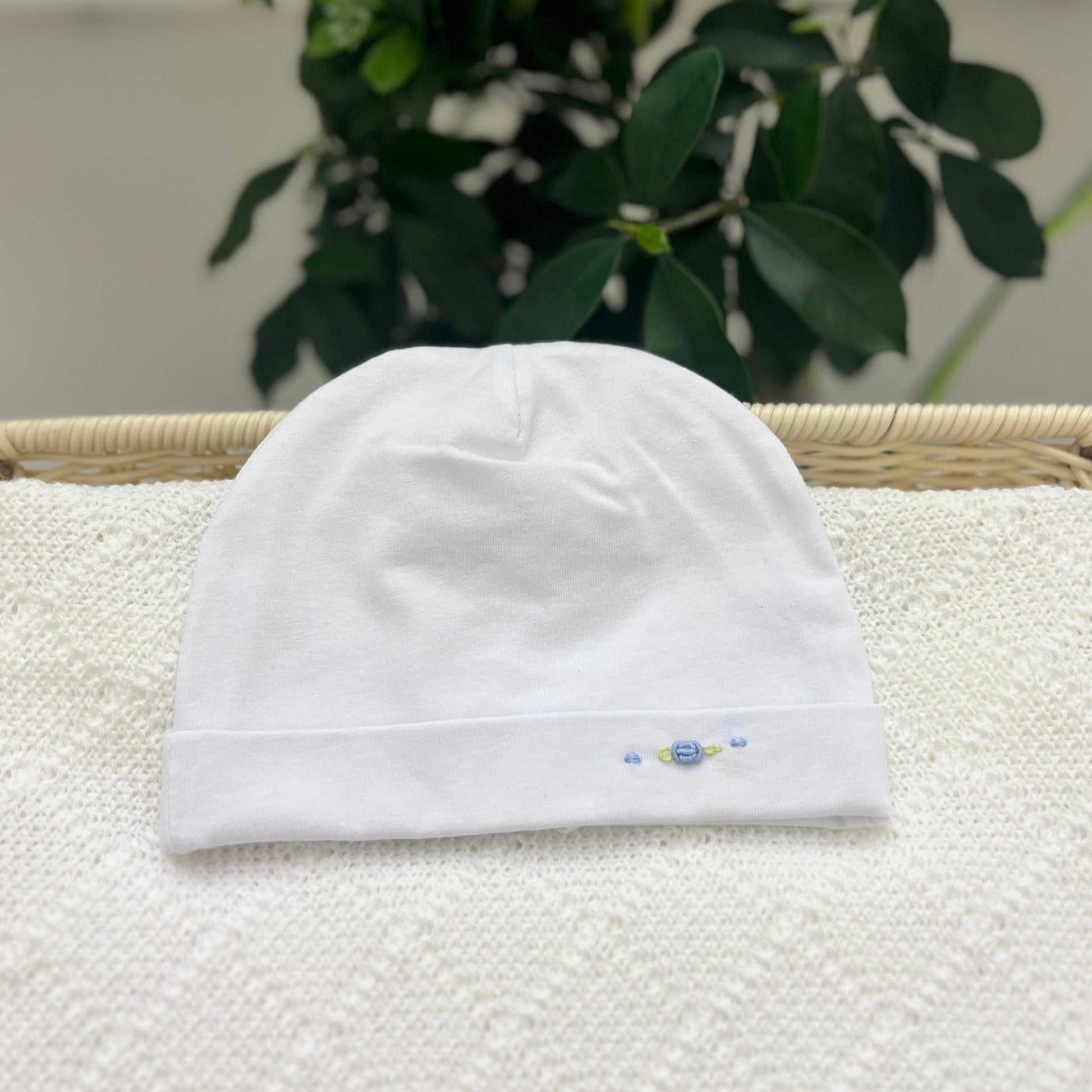 Cappellino per neonata in cotone jersey, morbido e delicato. Le rosettine a vapore come dettaglio donano un tocco elegante e romantico, perfetto per completare un look raffinato e confortevole.