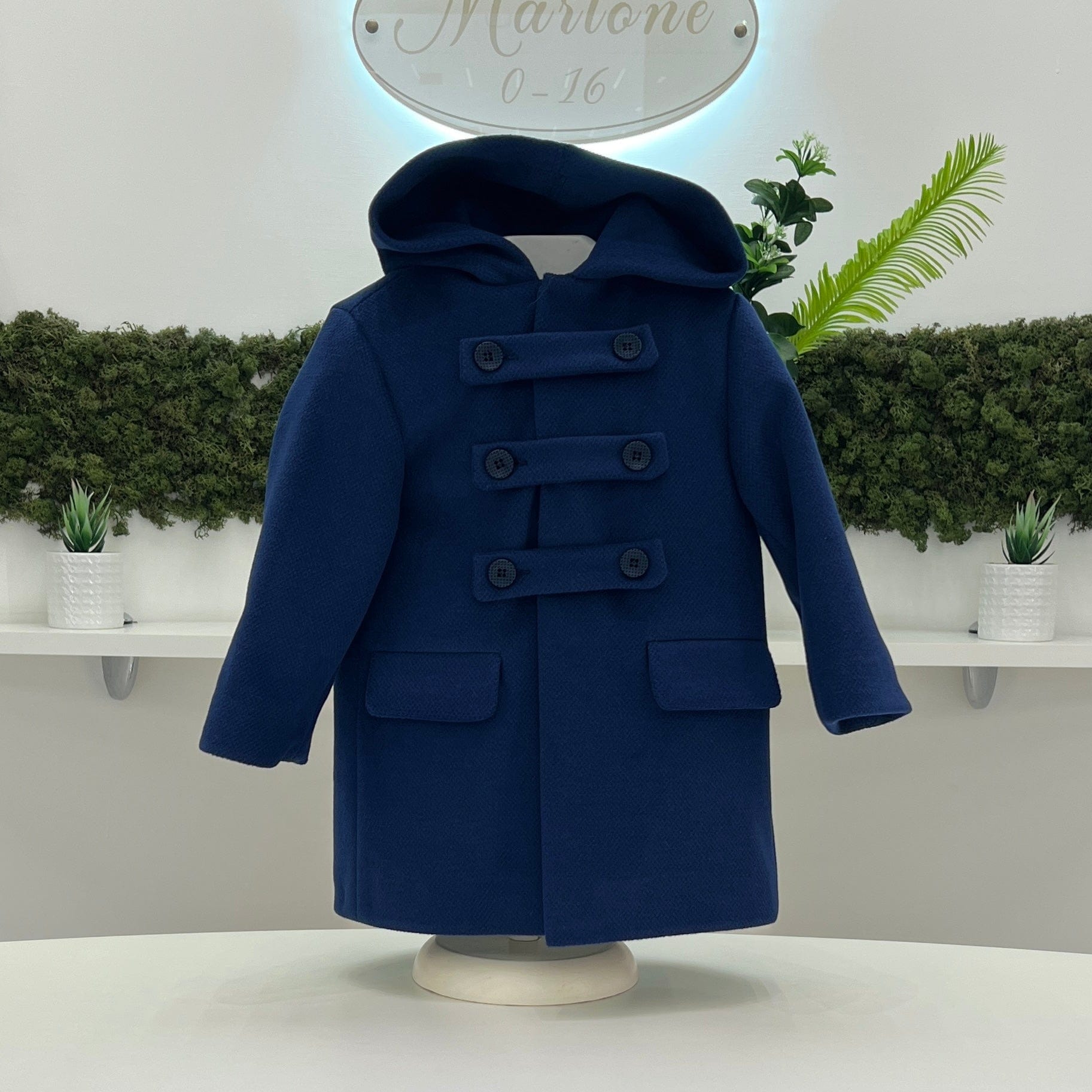 Cappotto blu doppiopetto in panno con cappuccio e finte tasche frontali.