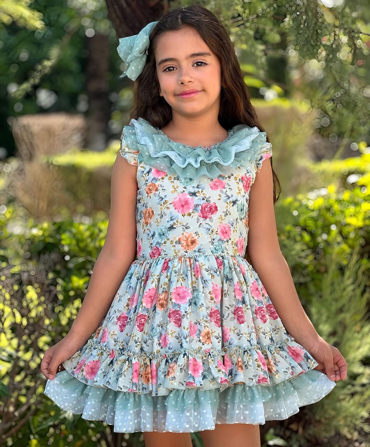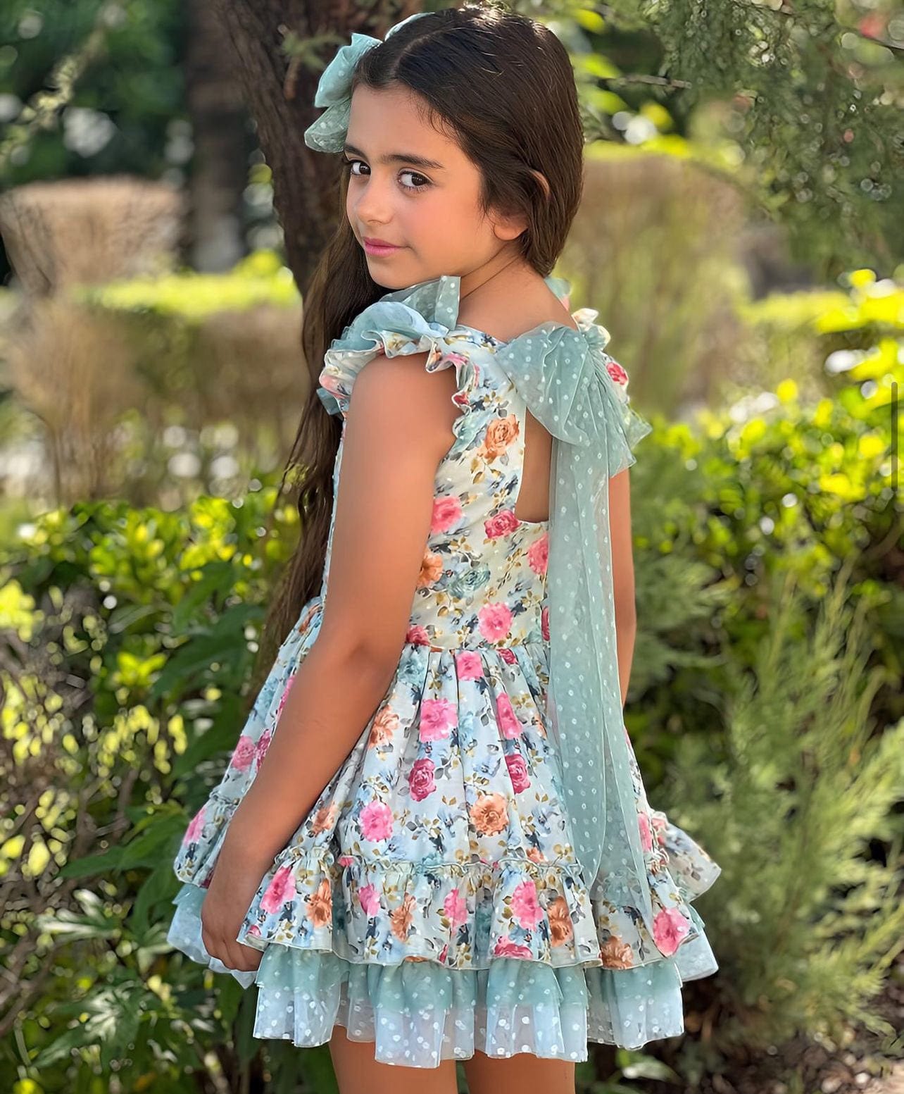 Abito bimba con culotte, gonna a doppia balza, bordata in tulle arricciato, fantasia floreale e fiocchetti in tulle sulle spalle e sul retro.