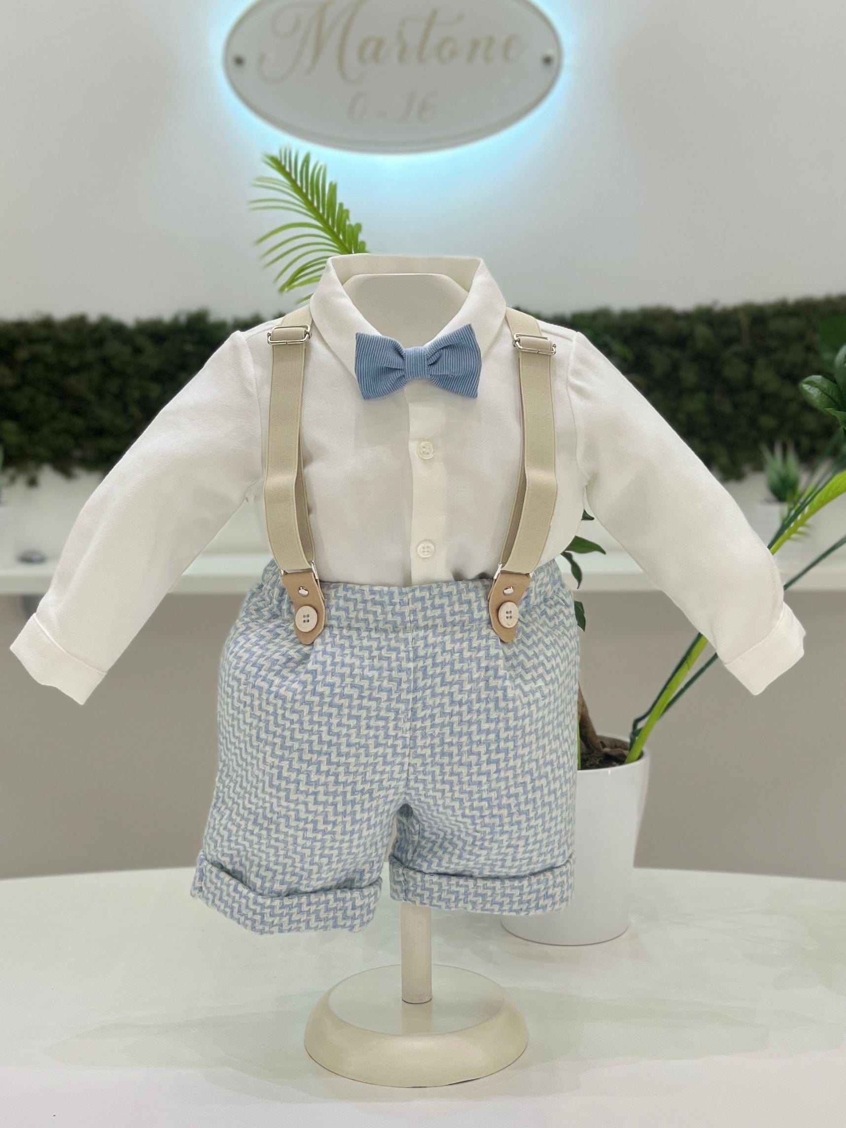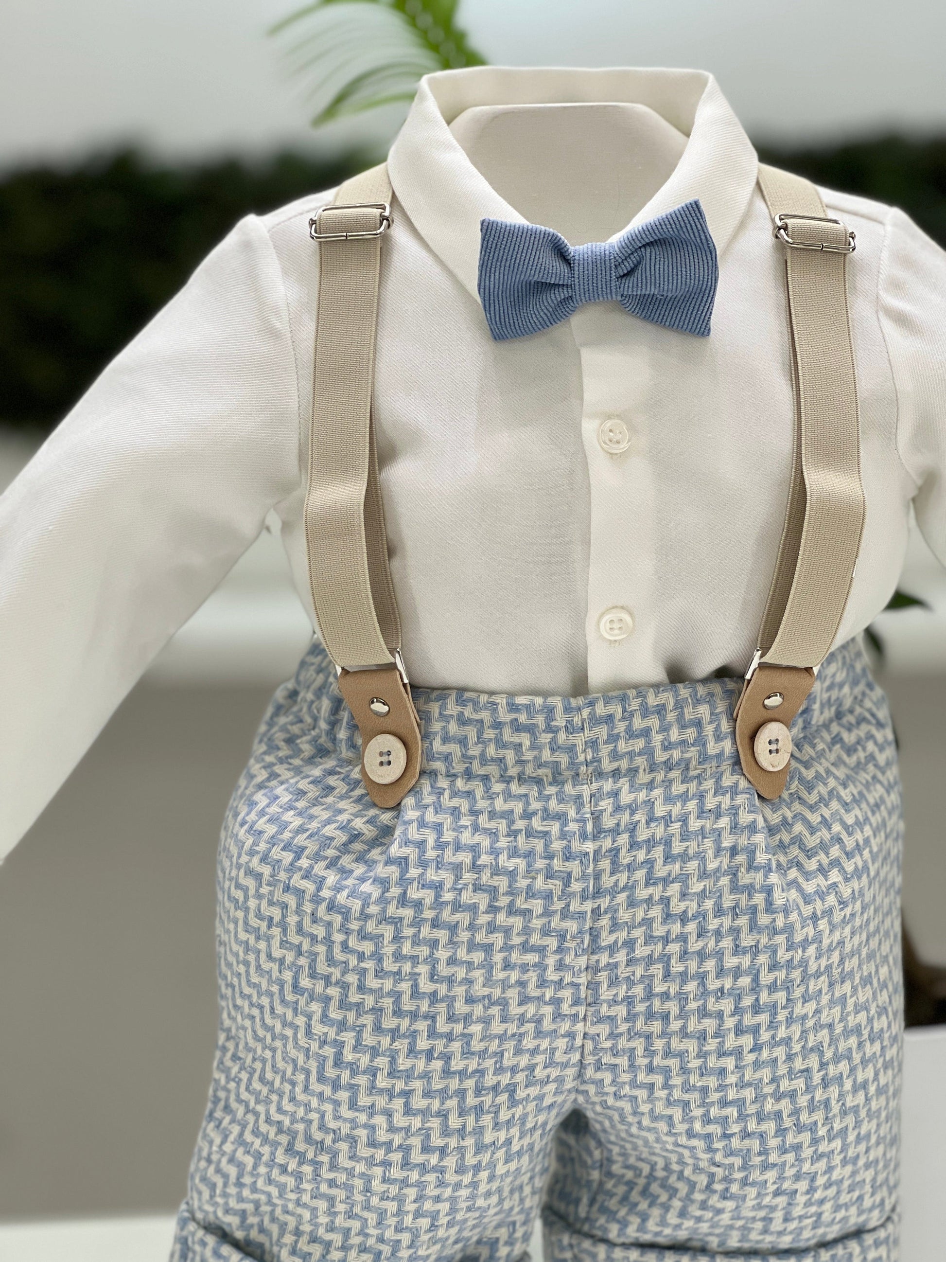 Un elegante completo per bimbo che include pantaloni in caldo cotone operato, ideali per tenere il piccolo comodo e al caldo. La camicia a body in cotone rigato panna offre un tocco di freschezza e praticità. Le bretelle aggiungono un dettaglio stiloso e classico, mentre il papillon completa il look con un accento di raffinatezza, rendendo il completo perfetto per le occasioni speciali.