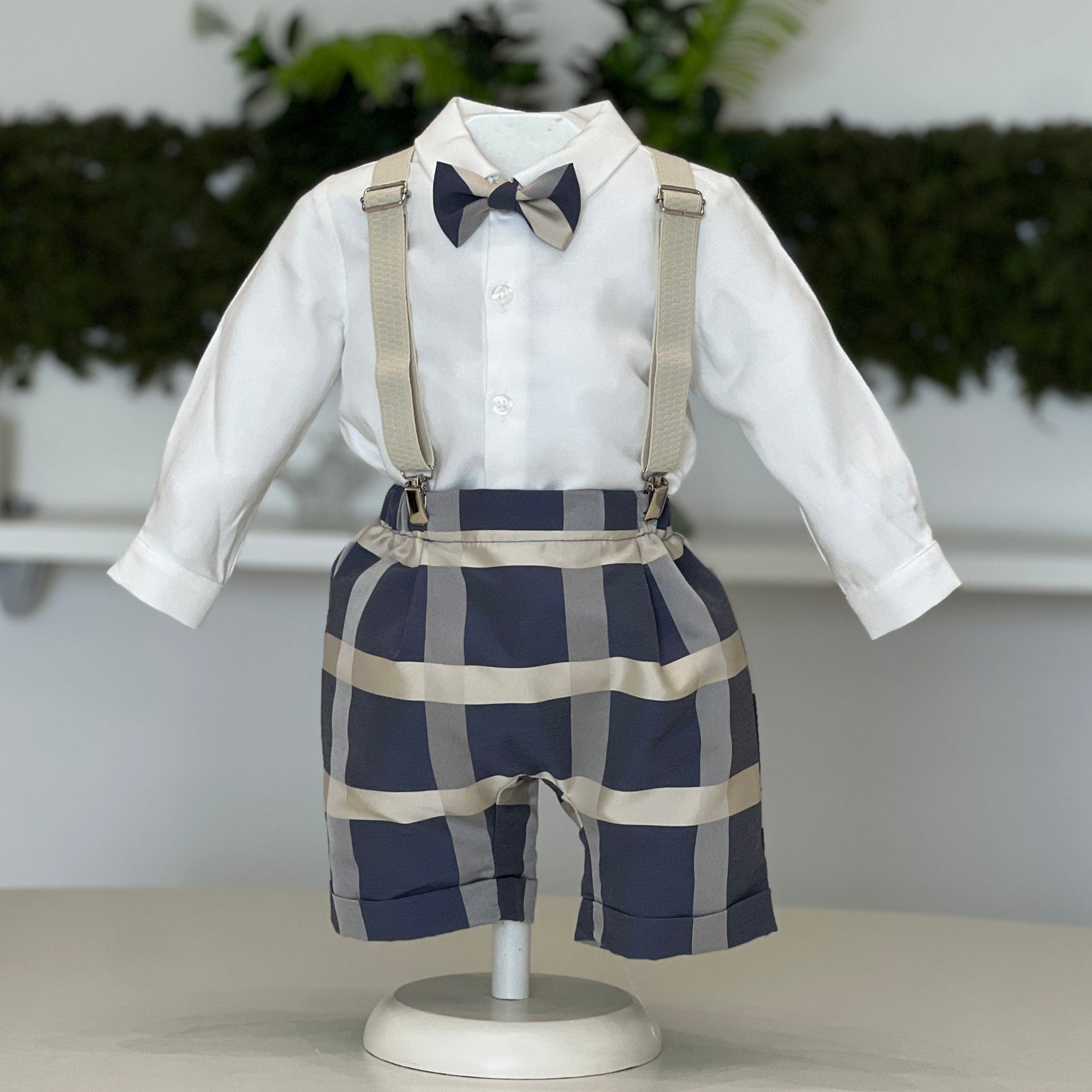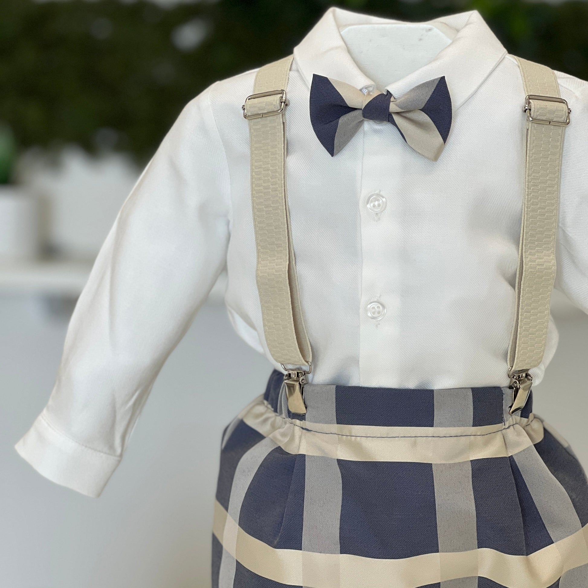 Completo elegante per bimbo composto da pantaloncini in taffetà a quadri, bretelle, papillon e camicia body. Perfetto per cerimonie e occasioni speciali.