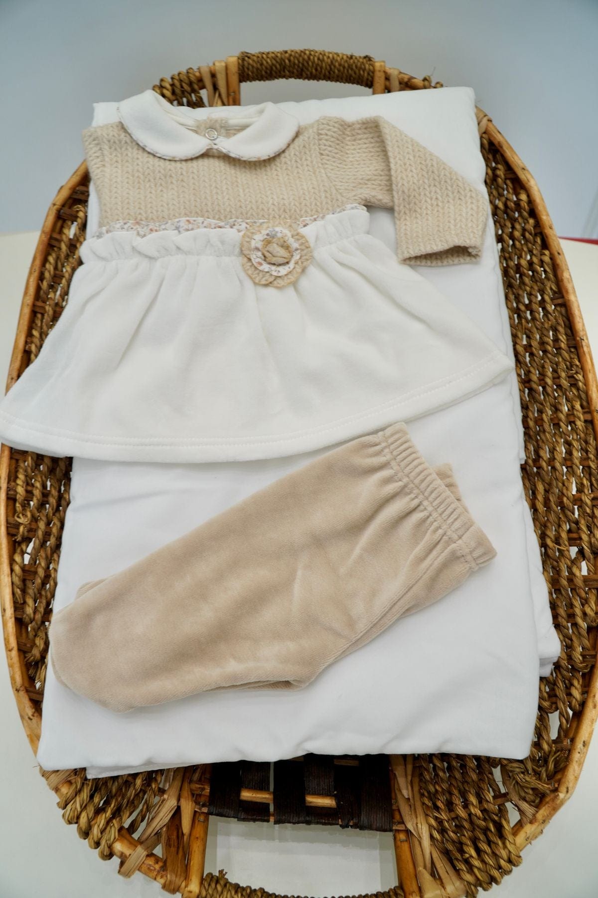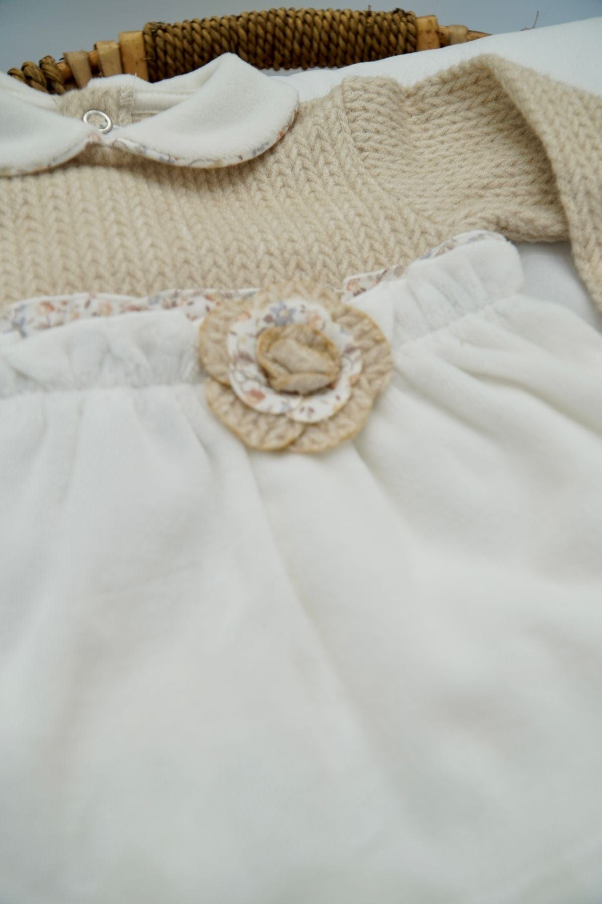 Tutina spezzata in beige e panna con fascia in vita con fiore