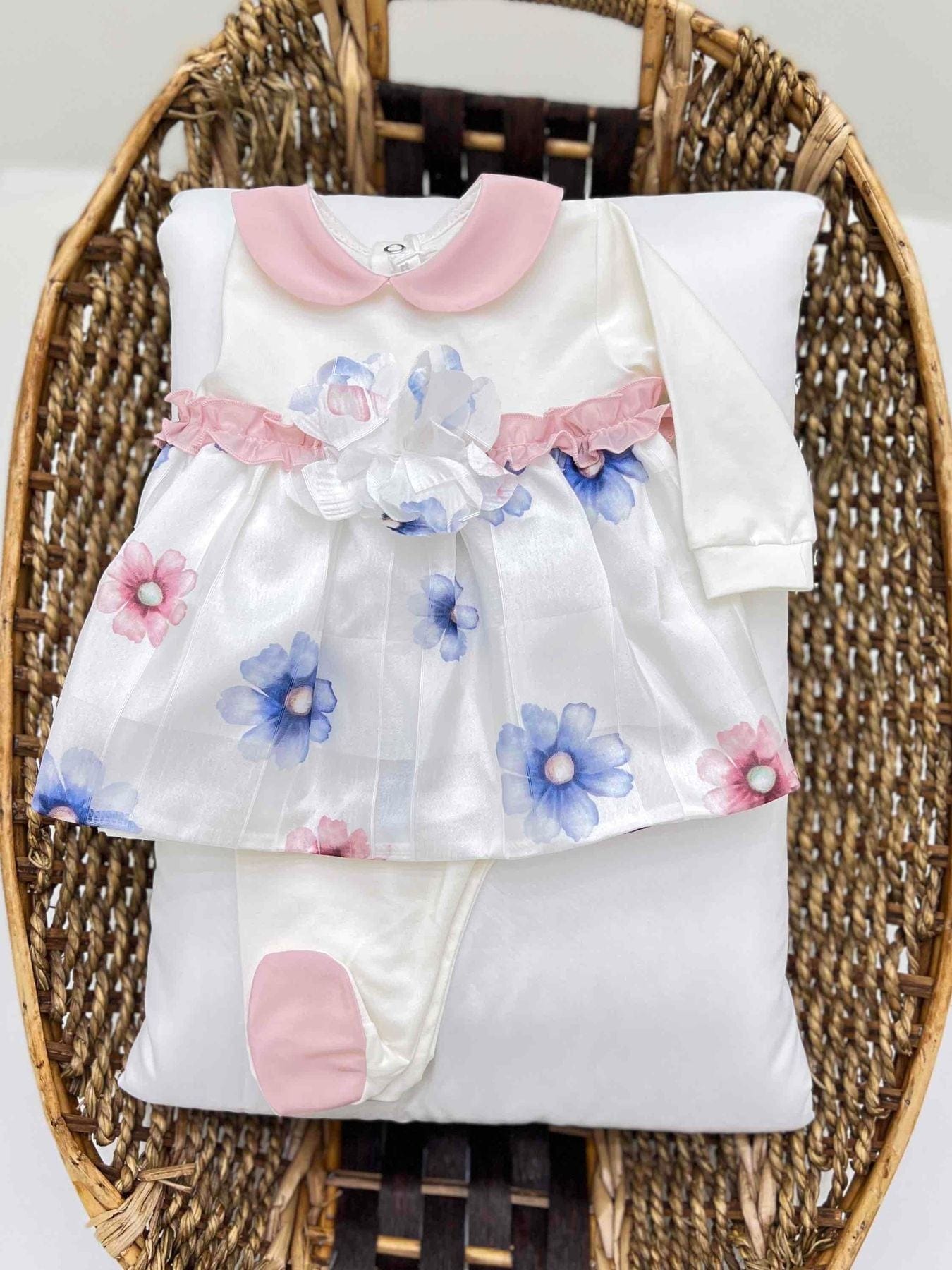 Completo clinico neonata due pezzi in cotone, con applicazione in organza con fantasia floreale.