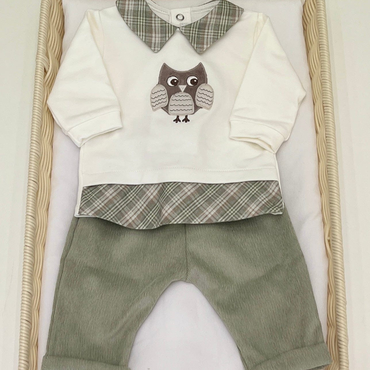 Completo per neonato composto da una maglia felpata in caldo cotone con colletto, morbida e confortevole, abbinata a pantaloni coordinati in velluto millerighe verde salvia, perfetti per offrire stile e comfort.